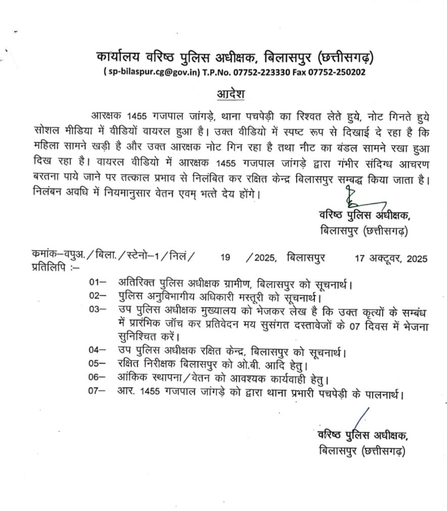 वायरल वीडियो पर संज्ञान लेते हुए एसएसपी ने तत्काल कार्रवाई करते हुए आरक्षक गजपाल जांगड़े को निलंबित कर दिया है! और मुख्यालय स्तर पर प्राथमिक जांच के आदेश जारी किए हैं!