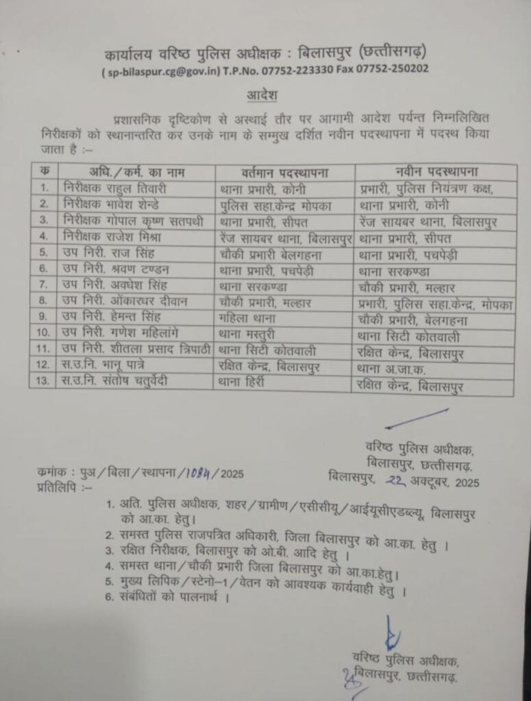 और भाजपाइयों ने थाना प्रभारी के खिलाफ कार्रवाई की मांग की थी! इसी विवाद के कुछ दिनों बाद पुलिस अधीक्षक ने तबादला आदेश जारी करते हुए थाना प्रभारी गोपाल सतपथी को साइबर सेल की जिम्मेदारी सौंपी है! जबकि राजेश मिश्रा को थाना सीपत का नया प्रभारी बनाया गया है! इसके अलावा चौकी मोपका प्रभारी भावेश शेंडे को थाना कोनी का प्रभार दिया गया है! वहीं बेलगहना प्रभारी राज सिंह को थाना मल्हार का नया प्रभारी नियुक्त किया गया है! सरकंडा थाना में पदस्थ अवधेश सिंह को मल्हार चौकी प्रभारी की जिम्मेदारी सौंपी गई है! इस तबादला सूची में कई प्रधान आरक्षक और आरक्षकों के नाम भी शामिल हैं! जिन्हें विभागीय आवश्यकता और प्रशासनिक सुविधा को ध्यान में रखते हुए नई जिम्मेदारियां दी गई हैं!