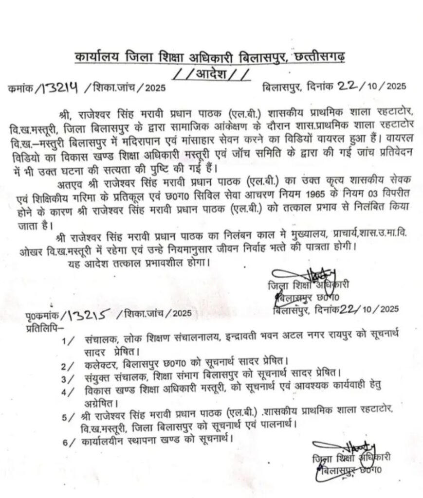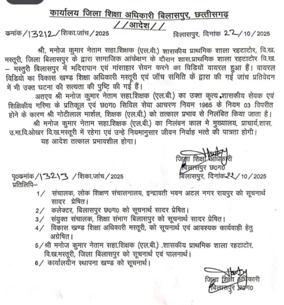 मस्तूरी क्षेत्र में फिर शिक्षकों द्वारा की जा रही कर शराब और मुर्गा पार्टी. और नशे में गाली गलौच, शिक्षकों की करतूत उजागर होने के बाद जिला शिक्षा अधिकारी ने बच्चों सहित अभिभावकों के मन में बढ़ते भय और आक्रोश को देखते हुए शिक्षा व्यवस्था को शर्मसार करने वाली घटना की गंभीरता को देखते हुए पूरे मामले में प्रधान पाठक राजेश्वर मरावी और शराबी शिक्षक मनोज नेताम को निलंबित करने का आदेश जारी कर दिया है!