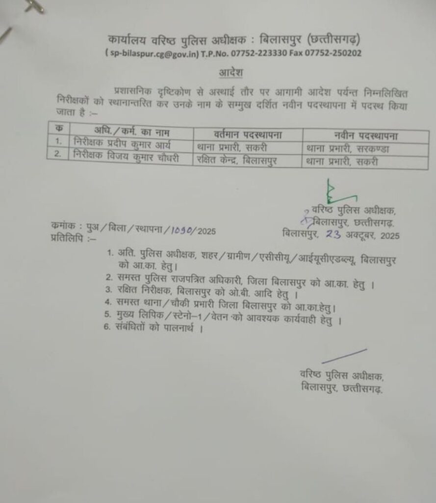 बिलासपुर,,, जिले में कानून व्यवस्था को सुदृढ़ बनाए रखने और थाना प्रभारियों की कार्यकुशलता के आधार पर लगातार फेरबदल कर रहे वरिष्ठ पुलिस अधीक्षक रजनेश सिंह ने गुरुवार को एक बार फिर महत्वपूर्ण तबादले किए हैं! 23 अक्टूबर को जारी आदेश के मुताबिक सकरी थाना प्रभारी निरीक्षक प्रदीप आर्य को अब सरकंडा थाना प्रभारी की जिम्मेदारी सौंपी गई है!