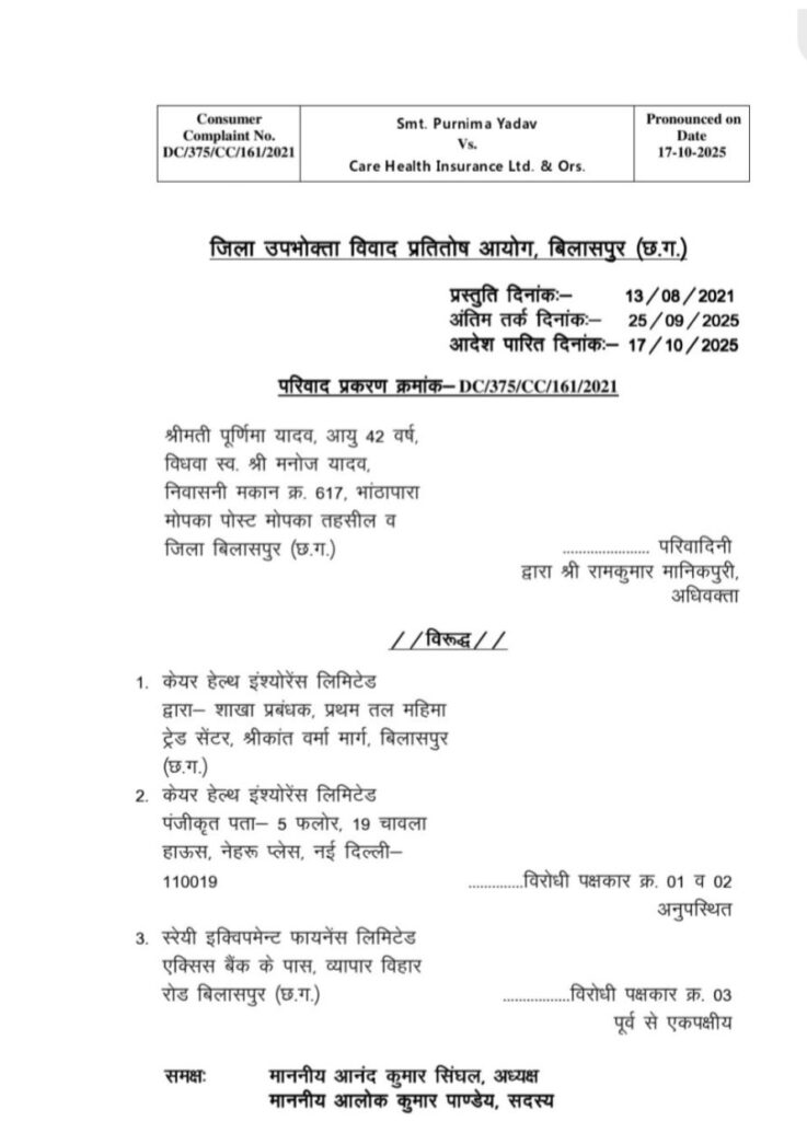 आयोग के सदस्य आलोक पाण्डेय ने बताया कि शहर के मोपका भाटापारा निवासी पूर्णिमा यादव पति स्व मनोज यादव ने केयर हेल्थ इंश्योरेंस लिमिटेड के खिलाफ दायर परिवाद में बताया कि उसके पति ने एक गाड़ी खरीदी थी!