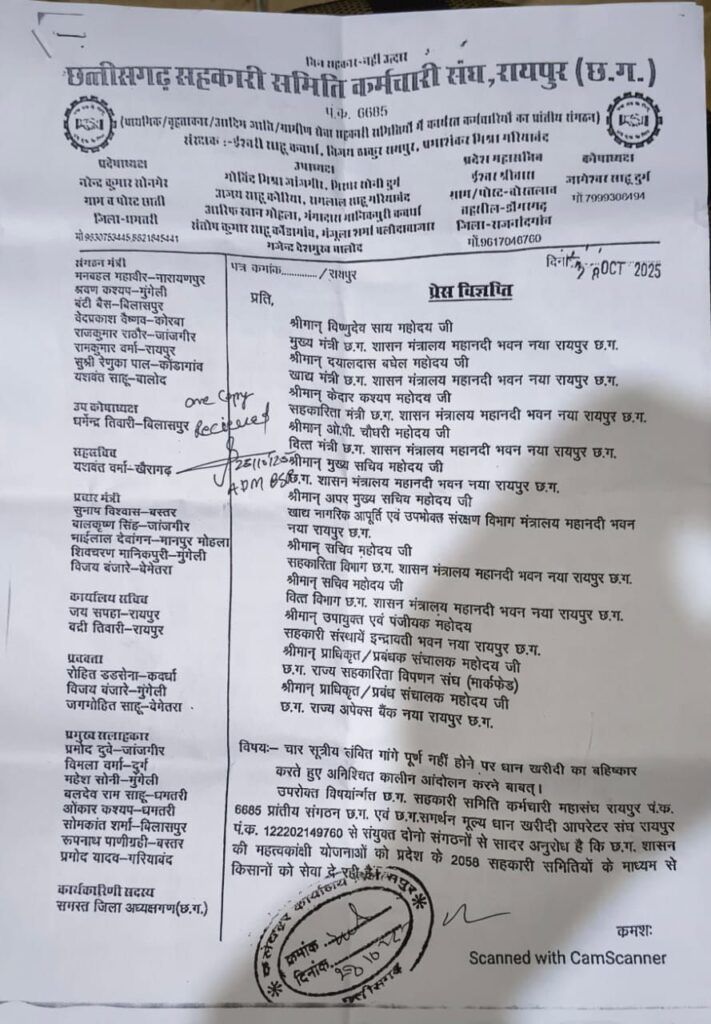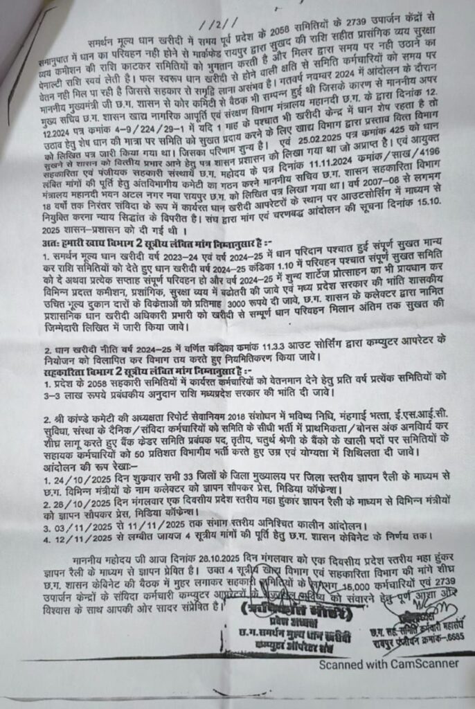 इन कर्मचारियों ने सुखद राशि समिति को देने आऊट शोषिंग बंद कर सालों से सेवा दे रहे कंप्यूटर ऑपरेटरों को नियमित करने सहकारी समितियों के कर्मचारियों को पूरे साल भर का वेतन प्रदाय करने श्री कांडे कमेटी के रिपोर्ट सेवा नियम को लागू करने की मांग रखी साथ ही मांग पूरी न होने पर 15 नवंबर से होने वाले धान खरीदी का बहिष्कार करने की चेतावनी दी….