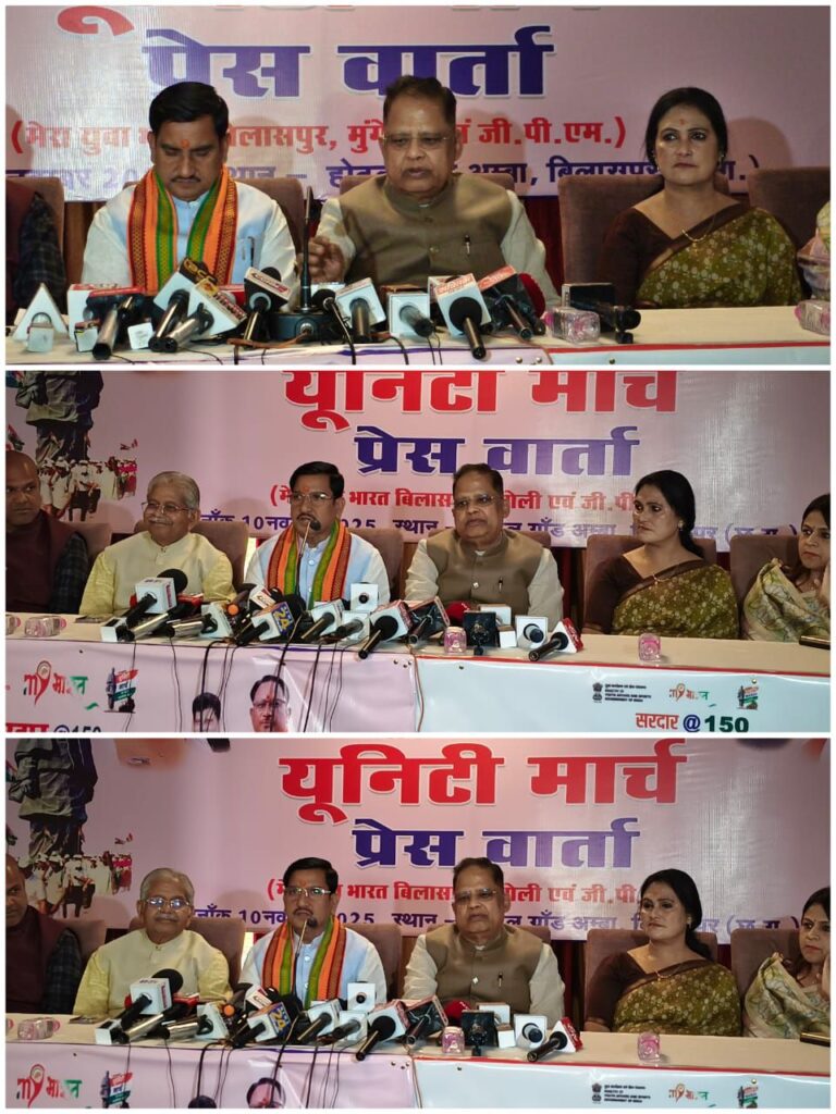 बिलासपुर,,,, लौह पुरुष सरदार वल्लभ भाई पटेल की 150 वी जयंती पर भाजपा ने 3 दिवसीय यूनिटी मार्च का आयोजन किया है! 11 से 13 नवंबर तक आयोजित इस यूनिटी मार्च के संबंध में केंद्रीय राज्य मंत्री तोखन साहू ने एक होटल में आयोजित प्रेस वार्ता में इस आयोजन की जानकारी दी…