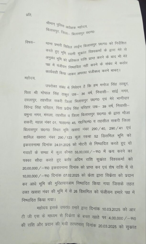 कि उन्होंने तय सौदे की अधिकांश रकम चुका दी, लेकिन इसके बावजूद पूरी जमीन का पंजीयन उनके नाम पर नहीं किया गया! मामला अब पुलिस अधीक्षक बिलासपुर को लिखित शिकायत के बाद जांच के दायरे में आ गया है…!