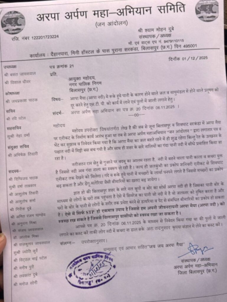 बिलासपुर,,,, न्यूज बास्केट अरपा अर्पण अभियान के संयोजक ने निगम आयुक्त को ज्ञापन सौंपकर अंचल वासियो के आस्था के प्रतीक माँ अरपा को गन्दगी मुक्त करने उचित प्रबंधन की मांग की है!