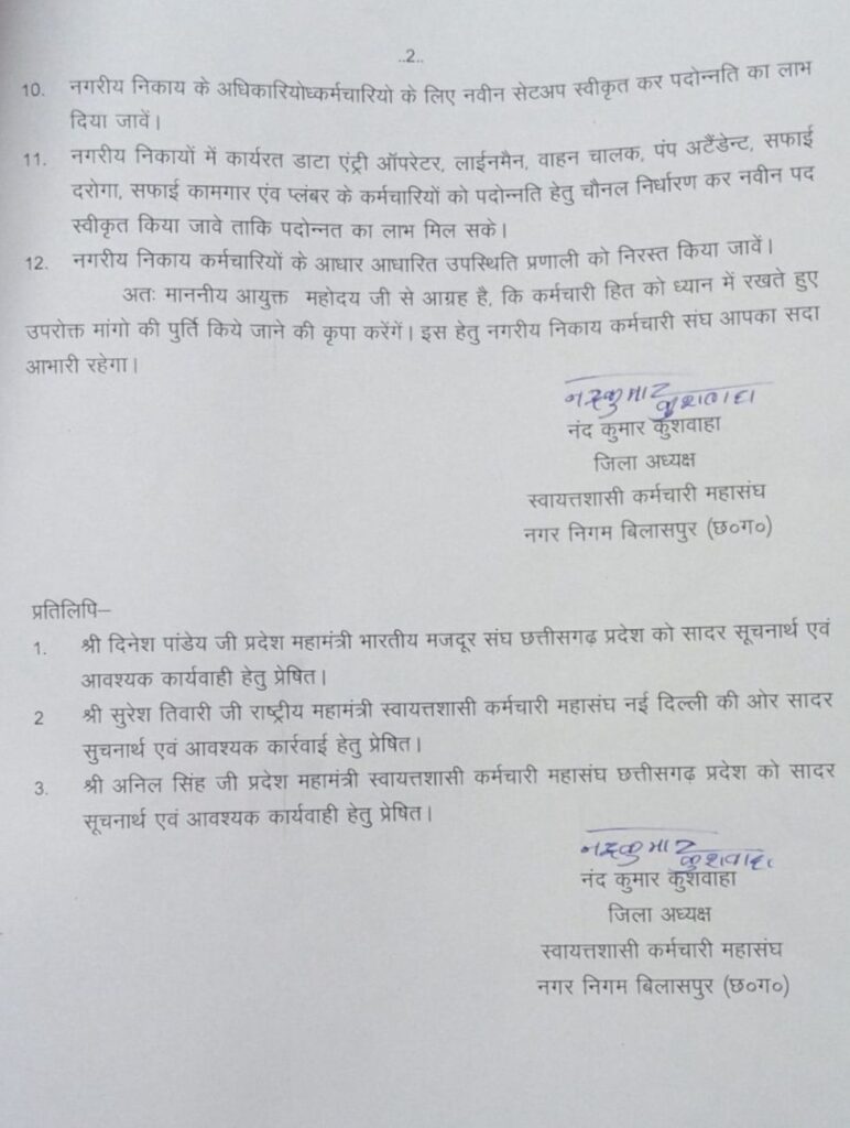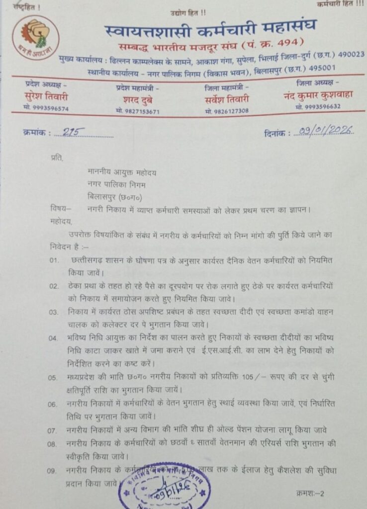 बिलासपुर,,, स्वायत्तशासी कर्मचारी महासंघ ने शुक्रवार को झंडा लहरा निगम आयुक्त को ठेका प्रथा समाप्त करने समेत 12 सूत्रीय मांगों का ज्ञापन सौंपा…