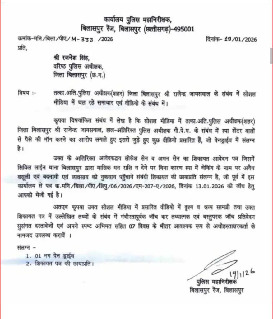 तत्कालीन अति. पुलिस अधीक्षक (शहर) राजेन्द्र जायसवाल के सोशल मीडिया में चल रहे समाचार एवं वीडियो का हवाला देते हुए कहा है! कि स्पा सेंटर वालों से पैसे की माँग करने के आरोप लग रहे जो बेहद गम्भीर है! इससे जुड़े प्रसारित वीडियो पेनड्राईव और आवेदकद्वय लोकेश सेन व अमन सेन का शिकायत आवेदन पत्र जिसमें सिविल लाईन थाना बिलासपुर द्वारा मासिक घन राशि न देने पर बिना कारण स्पा में चेकिंग के नाम पर अवैध वसूली एवं बदनामी एवं व्यवसाय को नुकसान पहुँचाने संबंधी शिकायत की छायाप्रति संलग्न है! जो पूर्व में इस कार्यालय से पत्र क.मनि/बिला/पीए/शिपु/06/2026/एम-207-ए/2026, दिनांक 13.01.2026 को जाँच हेतु आपको भेजी गई है!