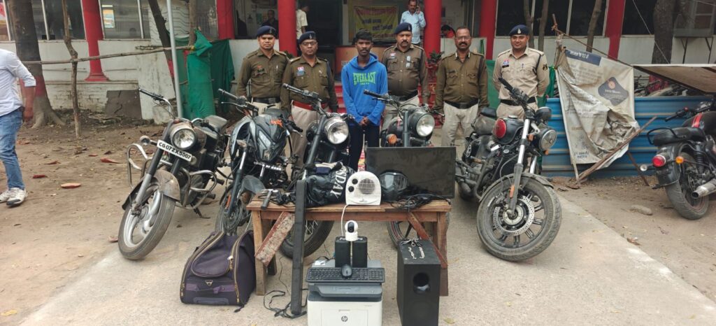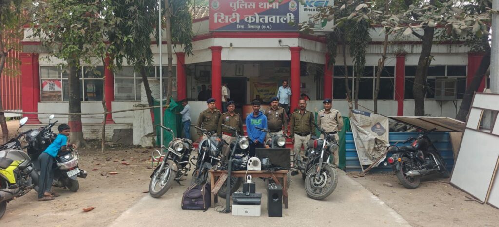 बिलासपुर,,, बिलासपुर के सिटी कोतवाली पुलिस ने मोटर साइकिल चोर गिरोह पर बड़ी कार्रवाई करते हुए 5 चोरी की मोटर साइकिल समेत लाखों का मशरूका बरामद किया है! पुलिस ने आयुष एक्का सहित दो अपचारी बालकों को गिरफ्तार किया है! जबकि एक आरोपी फरार है! आरोपियों से बुलेट, पल्सर, जावा बाइक के साथ इलेक्ट्रॉनिक सामान, चांदी के जेवर और चोरी में प्रयुक्त औजार जप्त किए गए… मुखबिर सूचना पर हैप्पी स्ट्रीट के पास आरोपियों को पकड़ा गया… पूछताछ में उन्होंने शहर के अलग-अलग थाना क्षेत्रों में बाइक और सूने मकानों में चोरी करना कबूल किया… पुलिस ने सभी आरोपियों को न्यायिक रिमांड पर भेज दिया है!