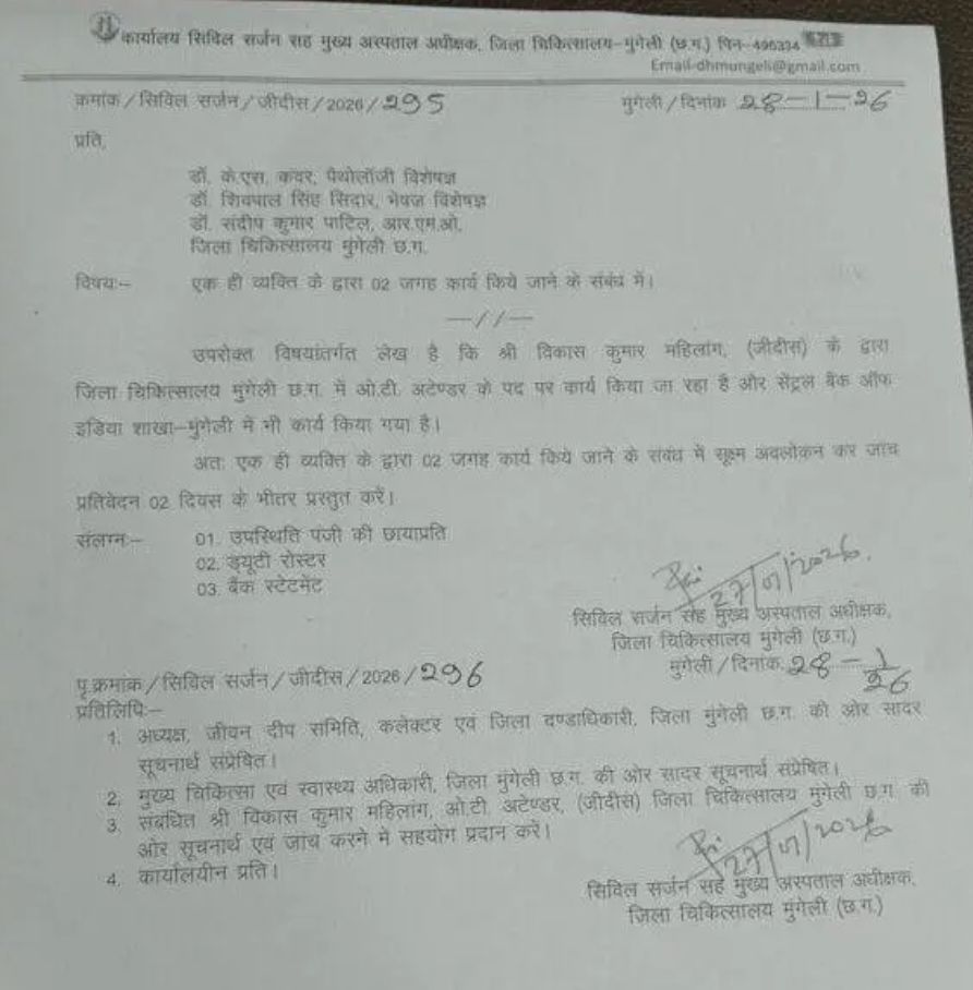 मुंगेली,,, जिला चिकित्सालय मुंगेली में एक ही व्यक्ति द्वारा दो अलग-अलग स्थानों पर कार्य करने का गंभीर मामला सामने आने के बाद स्वास्थ्य विभाग में हड़कंप मच गया है! सिविल सर्जन सह मुख्य अस्पताल अधीक्षक ने मामले को गंभीरता से लेते हुए तत्काल जांच के आदेश जारी किए हैं!