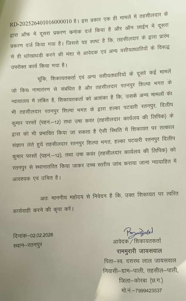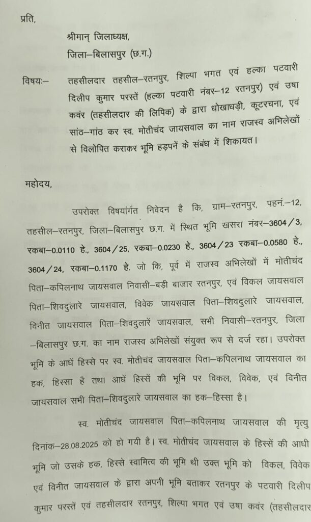 Uncategorized2026.02.02रतनपुर तहसील में जमीन का खेल! तहसीलदार शिल्पा भगत, पटवारी दिलीप परस्ते और रीडर उषा कंवर पर गंभीर आरोप, जमीन धोखाधड़ी मामले में कलेक्टर से शिकायत, मचा प्रशासनिक हड़कंप…