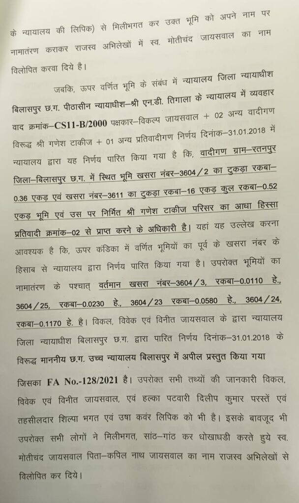 बिलासपुर,,, रतनपुर रतनपुर तहसील कार्यालय से जुड़े एक जमीन प्रकरण को लेकर तहसीलदार शिल्पा भगत, पटवारी दिलीप कुमार परस्ते एवं तहसीलदार रीडर उषा कंवर के खिलाफ कलेक्टर कार्यालय में लिखित शिकायत दर्ज कराई गई है!
