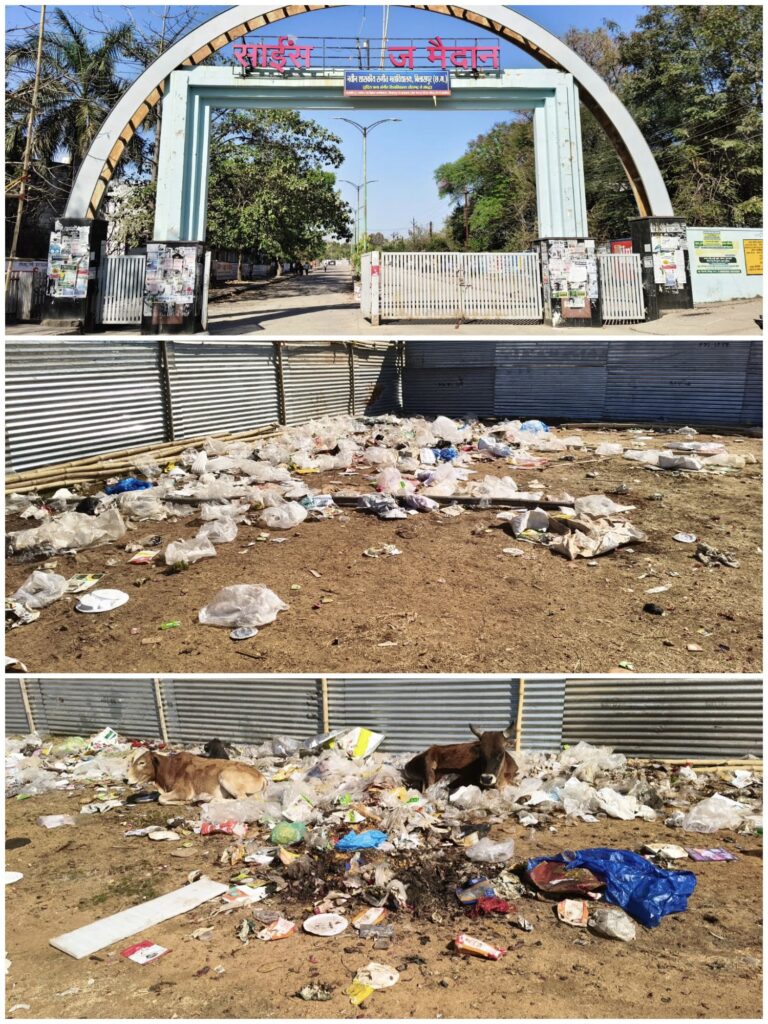 इस मौसम में खिलाड़ियों और मॉर्निंग वाकरो से आबाद रहने वाला सीपत रोड का साइंस कॉलेज मैदान कबाड़ी के ठिहा जैसे नज़र आ रहा है! चारों तरफ पॉलीथिन, कपड़ो के चिथड़े और जूठन डिस्पोजल प्लेट दोने बिखरे पड़े है!