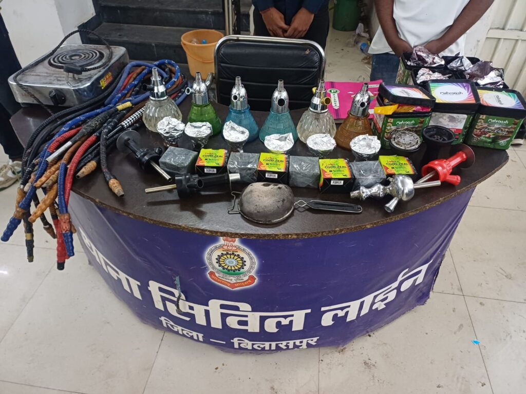 बिलासपुर,,, वरिष्ठ पुलिस अधीक्षक रजनेश सिंह के निर्देशानुसार एवं अतिरिक्त पुलिस अधीक्षक पंकज पटेल के मार्गदर्शन में नगर पुलिस अधीक्षक सिविल लाइन निमितेश सिंह के दिशा-निर्देशन में थाना सिविल लाइन पुलिस ने बड़ी कार्रवाई करते हुए एक अवैध रूप से संचालित हुक्का बार पर छापेमारी की… पुलिस ने मौके पर चल रहे गैरकानूनी हुक्का बार संचालन को तत्काल बंद कराया…