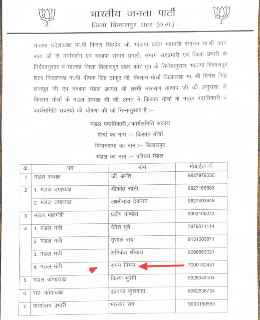 बिलासपुर,,, भारतीय जनता पार्टी के प्रदेशाध्यक्ष किरण सिंहदेव एवं प्रदेश महामंत्री संगठन पवन साय और उप मुख्यमंत्री अरुण साव मंडल अध्यक्ष बबलू कश्यप के मार्गदर्शन में तथा संभाग प्रभारी, सहप्रभारी और जिला प्रभारी के निर्देशानुसार भाजपा किसान मोर्चा, बिलासपुर शहर इकाई में मंडल पदाधिकारियों एवं कार्यसमिति सदस्यों की घोषणा की गई… यह निर्णय भाजपा जिला बिलासपुर शहर कोर ग्रुप की सहमति से लिया गया…