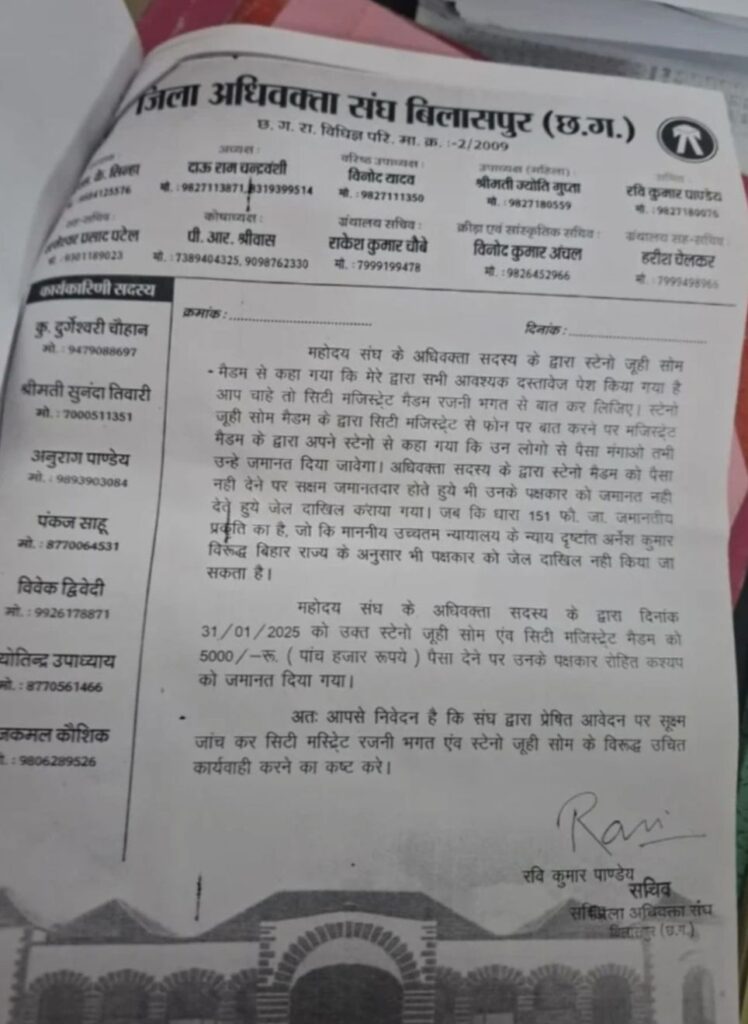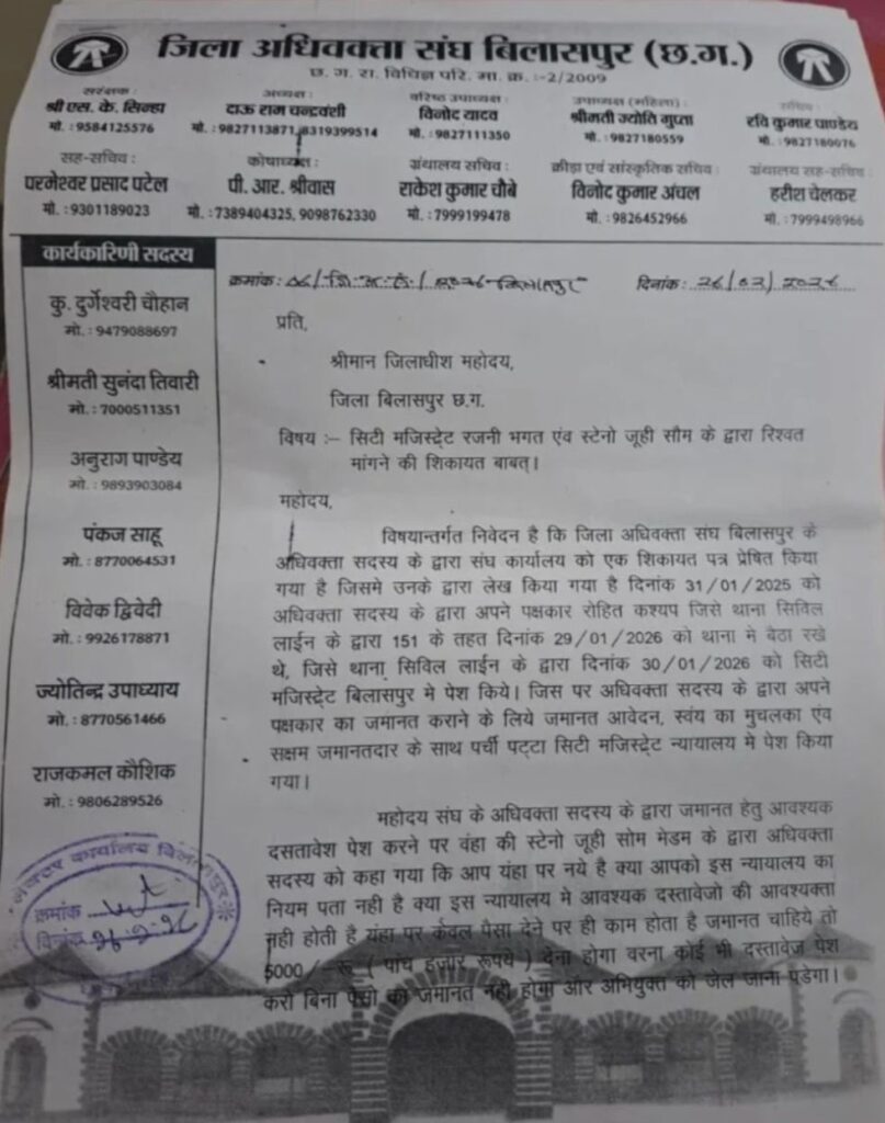 बिलासपुर,,, न्यायधानी के जिला अधिवक्ता संघ ने सिटी मजिस्ट्रेट रजनी भगत और स्टेनो जूही सोम पर जमानत प्रकरण में 5000 की रिश्वत मांगने का गंभीर आरोप लगाते हुए इसकी लिखित शिकायत कलेक्टर संजय अग्रवाल को सौंपकर मामले की निष्पक्ष जांच कराने मांग की है!