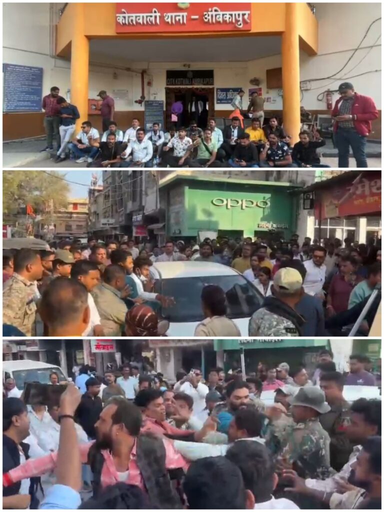 बिलासपुर,,, एक तरफ जहां छत्तीसगढ़ विधानसभा में पत्रकार प्रोटेक्शन एक्ट पर घमासान मचा है! वही दूसरी तरफ अम्बिकापुर में न्यूज रिपोर्टर के साथ समाचार कवरेज के दौरान भाजपा नेता द्वारा मारपीट का वीडियो वायरल हो रहा है! इस वारदात के विरोध में मीडिया कर्मियों ने मौके पर मौजूद पुलिस कर्मियों पर मूकदर्शक बने रहने का आरोप लगा… बीजेपी नेता और उसके हमलावर समर्थकों की गिरफ्तारी और सख्त कार्रवाई की मांग करते हुए वहां के कोतवाली थाने का घेराव कर जमकर नारेबाजी की…