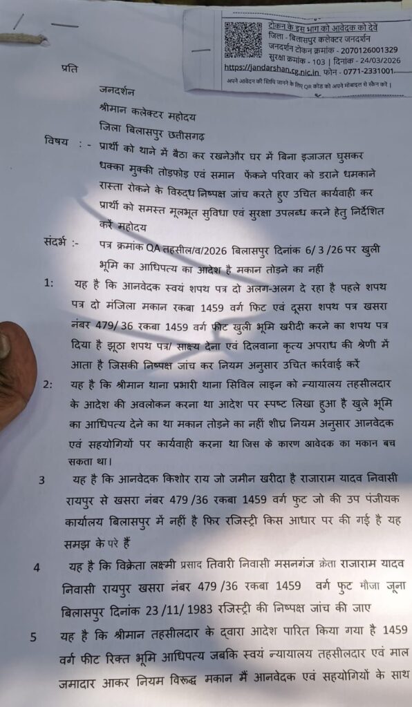 जमीन का अधिपत्य लिया… और अपने भाइयों और गुर्गों के साथ उसके घर में तोड़फोड़ और उनकी बीमार पत्नी से धक्का मुक्की कर जमीन के कब्जे के दस्तावेज के जरिए उनके मकान को तोड़वाकर उन्हें बेघर कर दिया… रवि ने बताया कि राजस्व न्यायालय से जब रिक्त भूमि के अधिपत्य का आदेश जारी किया गया है! तो मचकुरी की मौजूदगी में उनके मकान को कैसे ढहवा दिया गया… वो भी निजी एक्सीवेटर से ढहवा दिया गया… पीड़ित रवि का कहना है! कि वे वह और उनका परिवार अभी भी उसी अपने पैतृक जगह पर टीना टप्पर ठोक कर रह रहे है! पूर्व महापौर ने मकान को तोड़वाने के बाद मौके पर अपने अधिपत्य का बैनर टंगवा दिया है! उनका कहना है! कि उनका पूरा परिवार खुले आसमान के नीचे रह रहा है! पत्नी ब्रेनहेमरेज से पीड़ित है! बच्चों की परीक्षा है! पर कही कोई सुनवाई नहीं हो रही है! आलम यह है! कि जब वे रिपोर्ट लिखवाने सिविल लाइन थाना पहुंचे… तो उल्टे उन्हें ही सुबह से रात तक थाने में बिठा दिया गया… पीड़ित रवि और उनके परिवार ने कलेक्टर से न्याय की गुहार लगाई… रवि का कहना है! कि कलेक्टर ने उन्हें उचित कार्रवाई का आश्वासन दिया है!