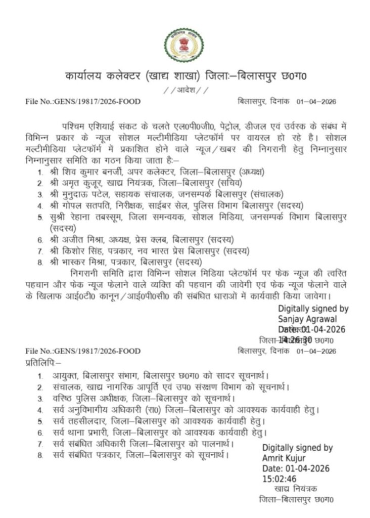 बिलासपुर,,, पश्चिम एशिया में उत्पन्न परिस्थितियों के बीच एलपीजी, पेट्रोल, डीजल एवं उर्वरक की उपलब्धता को लेकर सोशल मीडिया पर भ्रामक खबरों के प्रसार को गंभीरता से लेते हुए जिला प्रशासन ने कड़ा कदम उठाया है! कलेक्टर संजय अग्रवाल के निर्देश पर सोशल मीडिया प्लेटफॉर्म्स पर प्रसारित होने वाली खबरों की निगरानी के लिए एक विशेष समिति का गठन किया गया है!