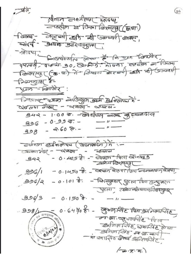 ग्राम बिजौर प.ह.न. 30 तहसील व बिलासपुर स्थित ख.न. 396/1 रकबा 0.36 एकड़, ख.न. 396/2 व 396/3 कुल रकबा 0.62 एकड़, 398/1 में से रकबा 0.80 एकड़ एवं पुनः रकबा 0.80 एकड़ भूमियों के नामांतरण हेतु नामांतरण प्रतिवेदन तत्कालीन हल्का पटवारी कौशल यादव द्वारा प्रस्तुत किया गया।
