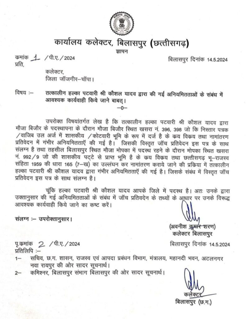 तथा तहसील बिलासपुर स्थित मौजा मोपका में पदस्थ रहने के दौरान मोपका स्थित खसरा नं. 992/9 जो की शासकीय पट्टे से प्राप्त भूमि है, के क्रय विक्रय तथा छत्तीसगढ़ भू-राजस्व संहिता 1959 की धारा 165 (7-ख) का उल्लंघन कर नामांतरण कराये जाने की प्रक्रिया में तत्कालीन हल्का पटवारी कौशल यादव द्वारा गंभीर अनियमितताएँ की गई है।शहर के अन्य पटवारियों के ऊपर ध्यान केंद्रित करने की आवश्यकता है कि राज्य शासन को पिछली सरकार के दौरान जिले के अन्य पटवारी के ऊपर आरोप लगाते आ रहे हैं चूंकि हल्का पटवारी कौशल यादव जांजगीर जिले में पदस्थ है।