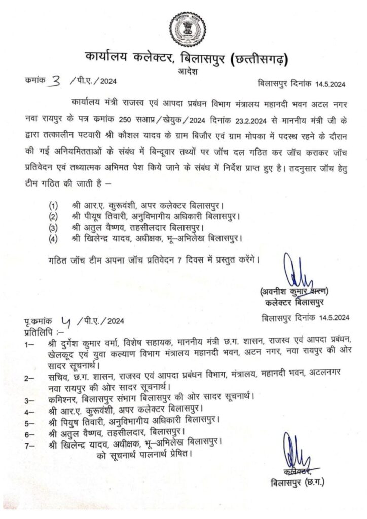 बिलासपुर राजस्व मंत्री के निर्देश पर पटवारी कौशल यादव के विरुद्ध शिकायतों की जांच के लिए कलेक्टर अवनीश शरण ने अपर कलेक्टर आरए कुरुवंशी की अध्यक्षता में जांच कमेटी गठित की है। समिति 10 बिंदुओं पर आधारित शिकायतों की जांच कर एक सप्ताह में रिपोर्ट देगी।