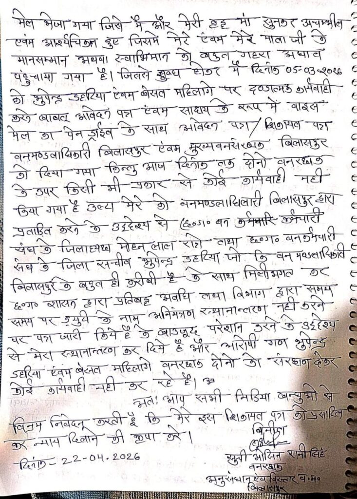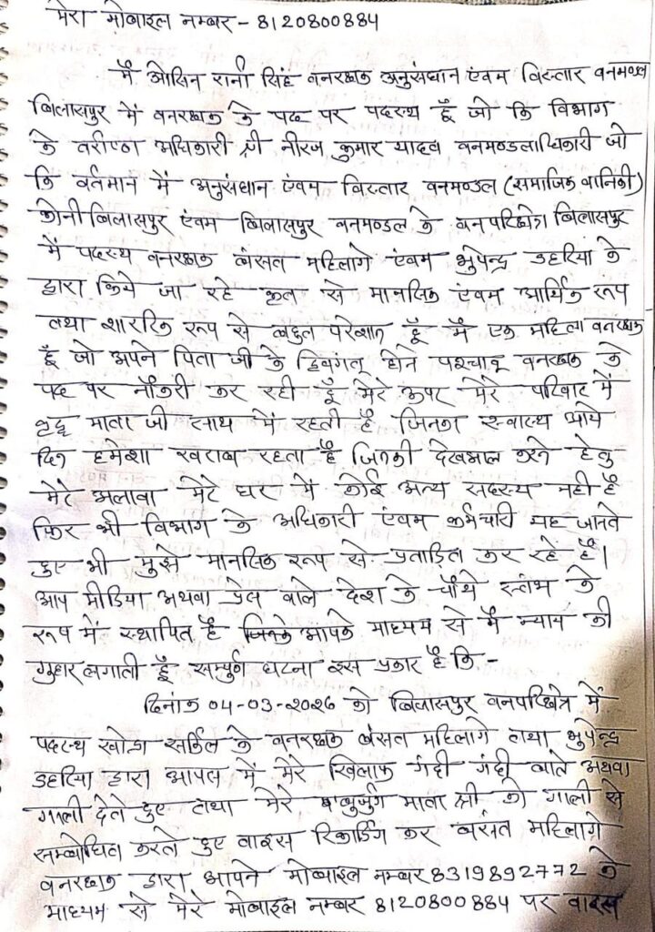बिलासपुर,,, महिला आरक्षण, महिला सशक्तिकरण, बेटी पढ़ाओ बेटी बचाओ के नारे वाले छत्तीसगढ़ में महिलाएं कितनी सुरक्षित है! ये बिलासपुर वनमण्डल के अनुसन्धान एवं विस्तार विभाग की महिला वनरक्षक ओसिन रानी सिंह के उस पत्र से समझ लीजिए…. जिसमे उन्होंने मीडिया को सम्बोधित करते हुए न्याय की गुहार लगाई है! कि कही उनकी कोई सुनवाई नही हो रही इसलिए मीडिया उनकी आवाज को उस सरकार तक पहुचाईये जो हेल्पलाइन सेवा का दावा कर रही… ताकि पता चले कि जंगल विभाग में कैसा जंगलराज चल रहा..