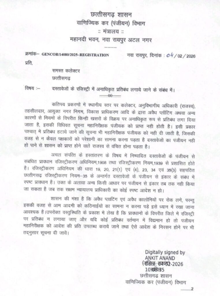 शासन ने अचल संपत्ति के हस्तांतरण के विषय में निष्पादित दस्तावेज के पंजीयन से संबंधित प्रावधान रजिस्ट्रीकरण अधिनियम, 1908 तथा रजिस्ट्रीकरण नियम, 1939 से प्रशासित होते है! रजिस्ट्रीकरण अधिनियम की धारा 19, 20, 21(1) एवं (4), 23, 34 एवं 35 (3) सहपठित छत्तीगसढ़ रजिस्ट्रीकरण नियम 35 के अन्तर्गत दस्तावेजों के पंजीयन से इंकार के संबंध में स्पष्ट प्रावधान है! उक्त के अलावा अन्य किसी आधार पर पंजीयन से इंकार तब तक नही किया जा सकता है जब तक सक्षम न्यायालय प्राधिकारी का कोई स्पष्ट आदेश न हो… शासन ने स्प्ष्ट किया कि