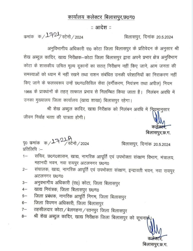 बिलासपुर : कोटा के खाद्य निरीक्षक शेख अब्दुल कादिर को सरकारी काम में लापरवाही के चलते निलंबित कर दिया गया है।