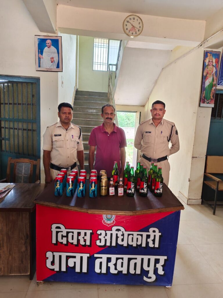 बिलासपुर, पुलिस अधीक्षक रजनेश सिंह (भापुसे) के द्वारा जिले में नशे, अवैध कारोबार करने वालो पर अंकुश लगाने विशेष अभियान प्रहार चलाकर कार्यवाही करने एवं थाना क्षेत्रांतर्गत निशीले पदार्थों का अवैध बिक्री व परिवहन करने वालों के विरूध्द अधिक से अधिक कार्यवाही करने के लिए निर्देशित किया गया है जिसके परिपालन में अवैध शराब बिक्री परिवहन करने वालो के उपर सतत् निगाह रखी जा रही है। एवं लोगो को अवैध कारोबार करने वालो की सूचना पुलिस को देने पुलिस अधीक्षक महोदय द्वारा बताया गया था। दिनाँक 27-मई-2024 को जरिये मुखबीर से सूचना मिला कि ग्राम भीमपुरी के मित्र मिलन ढाबा मे ढाबा संचालक राजीव मिश्रा शराब बिकी हेतु छुपा कर रखा है जिसकी सूचना तत्काल श्रीमान पुलिस अधीक्षक महोदय रजनेश सिंह (भापुसे) को देकर अतिरिक्त पुलिस अधीक्षक महोदया (ग्रामीण) श्रीमती अर्चना झा एवं श्रीमान अनुविभागीय अधिकारी (पुलिस) कोटा श्रीमति नूपूर उपाध्याय के मार्गदर्शन में थाना प्रभारी हरिश चंद्र टांडेकर के नेतृत्व में टीम गठित कर मुखबीर की सूचना तस्दीक एवं कार्यवाही हेतु हमराह स्टाफ एवं गवाह के ग्राम भीमपुरी मित्र मिलन ढाबा पहुंचकर मुखबीर के बताये हुए स्थान पर जाकर रेड कार्यवाही किये, और उक्त व्यक्ति के कब्जे से एक सफेद रंग के प्लास्टिक बोरी के अंदर रखा 05 नग गोवा स्पेशल शराब प्रत्येक में 180 एमएल भरा कीमती लगभग 650 रूपये,10 नग शिम्बा बियर बाटल प्रत्येक में 650 एमएल भरा कीमती लगभग 2200 रूपये, मेडोसा बियर केन 12 नग प्रत्येक में 500 एमएल भरा कीमती लगभग 2040 रूपये , बटवाईजर बियर केन 03 नग प्रत्येक में 500 एमएल भरा कीमती लगभग 600 रूपये कुल मात्रा 14.9 लीटर कुल कीमती लगभग 5490 रूपये को बरामद किया गया। आरोपी के कब्जे से उक्त शराब को जप्त कर आरोपी के विरूद्ध धारा 34(2) आबकारी एक्ट के तहत कार्यवाही किया जाकर आरोपी को ज्युडिशियल रिमाण्ड पर भेजा गया।