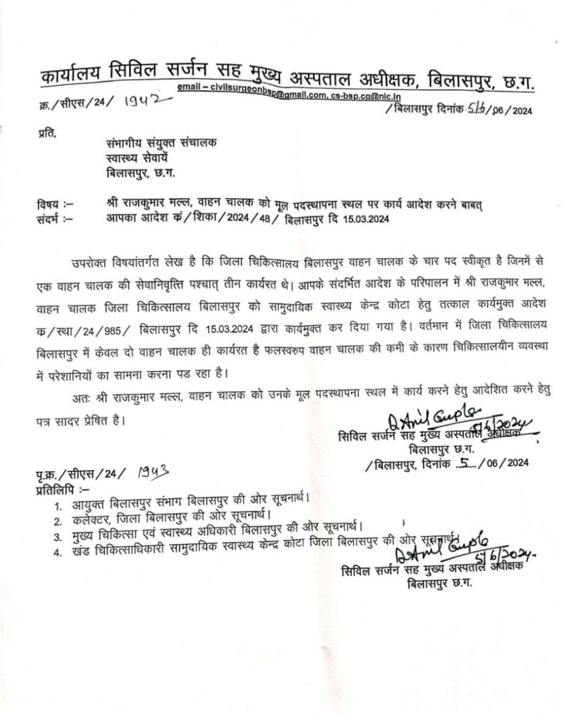 बिलासपुर-कलेक्टर के आदेश को भी नकारते हुए जिला अस्पताल के सिविल सर्जन अपनी मनमानी पर उतर आए हैं जी हां एक ऐसा ही मामला आचार संहिता खत्म होते ही देखने को मिला है। गौरतलब है कि जिला अस्पताल में ड्राइवर के पद पर कार्य करने वाले राजकुमार मल्ल की पिछले दिनों कलेक्टर से शिकायत की गई थी।