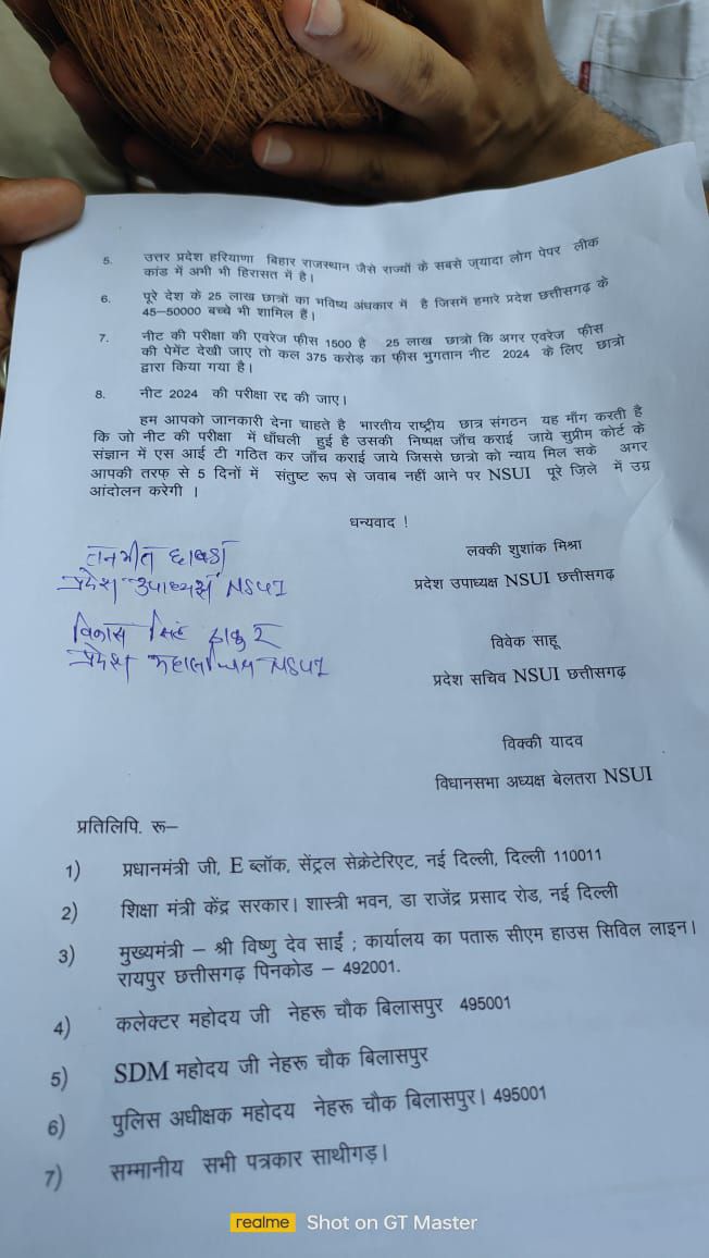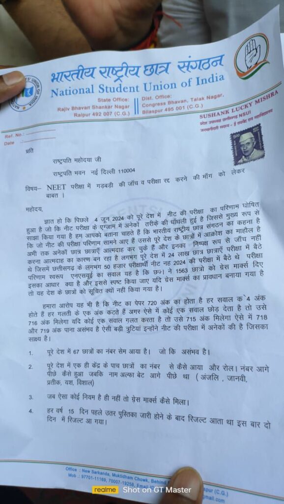 बिलासपुर।पिछले 04 जून को घोषित NEET की परीक्षा परिणामों को लेकर पूरे देश के छात्र,,छात्राओं में असंतोष व्याप्त है और इनके एग्जाम में धांधली का आरोप लगाया जा रहा है। इस परीक्षा परिणामों की जांच एवम परीक्षा रद्द करने की मांग को लेकर आज NSUI के प्रदेश उपाध्यक्ष लक्की मिश्रा एवम जिलाध्यक्ष तनमीत छाबड़ा के नेतृत्व में कलेक्टर को ज्ञापन सौपा गया है। इस दौरान एनएसयूआई के प्रदेश उपाध्यक्ष लक्की मिश्रा ने कहा कि नीट परीक्षा के एग्जाम में अनेकों तरीके की धाँधली हुई है जिससे मुख्य रूप से साझा किया गया है। हम आपको बताना चाहते हैं कि भारतीय राष्ट्रीय छात्र संगठन का कहना है कि जो नीट की परीक्षा परिणाम सामने आए हैं उससे पूरे देश के छात्रों में आक्रोश का माहौल है। ज्ञात हो कि पिछले 4 जून 2024 को पूरे देश में नीट की परीक्षा का परिणाम घोषित हुआ है जो कि नीट परीक्षा के एग्जाम में अनेकों तरीके की धाँधली हुई है जिससे मुख्य रूप से साझा किया गया है हम आपको बताना चाहते हैं कि भारतीय राष्ट्रीय छात्र संगठन का कहना है कि जो नीट की परीक्षा परिणाम सामने आए हैं उससे पूरे देश के छात्रों में आक्रोश का माहौल है अभी तक अनेकों छात्र छात्राएँ आत्मदाह कर चुके हैं और इनका निष्पक्ष रूप से जाँच नहीं करना आत्मदाह का कारण बन रहा है लगभग पूरे देश में 24 लाख छात्र छात्राएँ परीक्षा में बैठे थे जिसमें छत्तीसगढ़ के लगभग 50 हज़ार परीक्षार्थी नीट नह 2024 की परीक्षा में बैठे थे परीक्षा परिणाम स्वरूप एनएसयूई का सवाल यह है कि छ। ने 1563 छात्रों को ग्रेस मार्क्स दिए इसका आधार क्या है और इससे स्पष्ट किया जाए यदि ग्रेस मार्क्स का प्रावधान बनाया गया है तो यह देश के छात्रों को सूचित क्यों नहीं किया गया है।