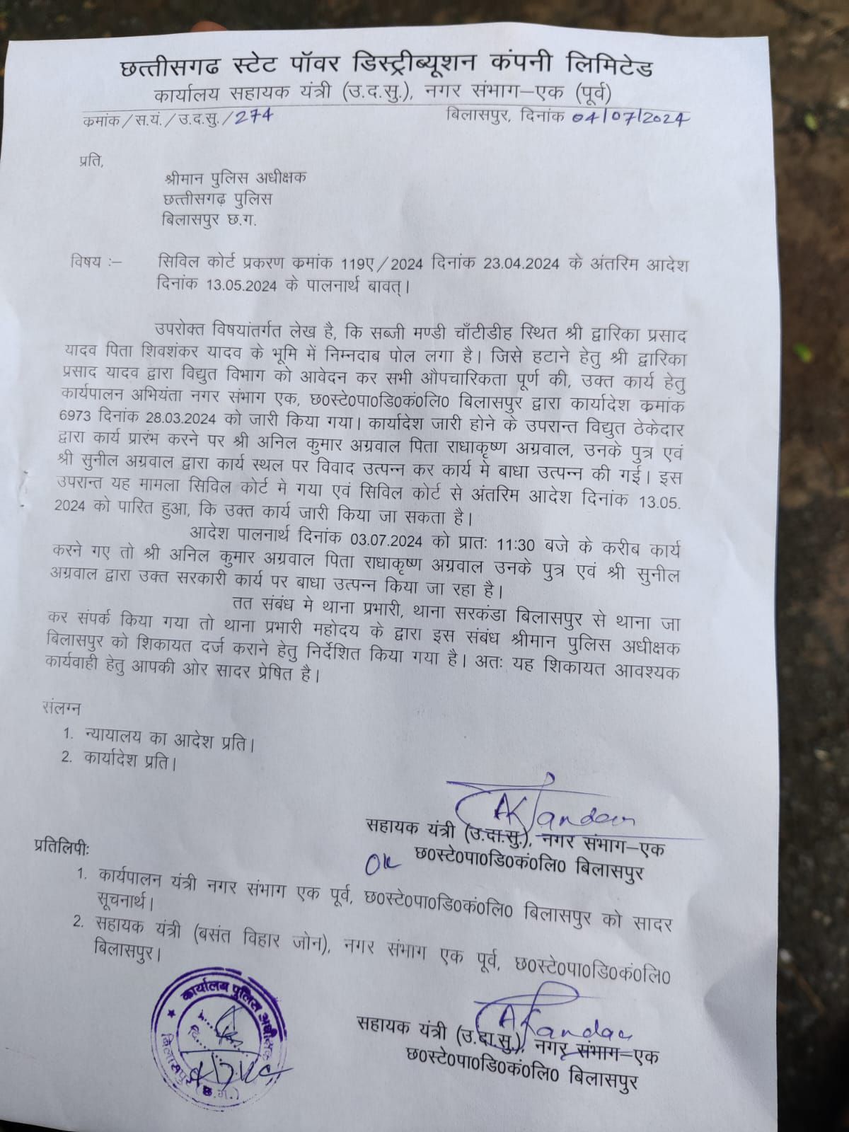 बिलासपुर,,,सिविल कोर्ट के आदेश का पालन करने बुधवार को चाटीडीह के पास विद्युत विभाग के कर्मचारी गए हुए थे। लेकिन कुछ लोग खंभे हटाने नहीं दिए और बिजली विभाग के कर्मचारियों से विवाद करने लगे।मामला इतना बढ़ गया कि इसकी शिकायत बिजली विभाग के कर्मचारियों ने एसपी से शिकायत की है।आपको बता दे कि सब्जी मण्डी, चाँटीडीह स्थित द्वारिका प्रसाद यादव पिता शिवशंकर यादव के भूमि में निम्नदाब पोल लगा है। जिसे हटाने के लिए द्वारिका प्रसाद यादव द्वारा विद्युत विभाग को आवेदन किया गया था। जिसकी सभी औपचारिकता पूर्ण होने के पश्चात बुधवार को उक्त कार्य हेतु कार्यपालन अभियंता नगर संभाग एक, छ०स्टे०पा० डि०कं०लि० बिलासपुर द्वारा कार्यादेश क्रमांक 6973 दिनांक 28.03.2024 को जारी किया गया।कार्यादेश जारी होने के उपरान्त विद्युत ठेकेदार द्वारा कार्य प्रारंभ करने मौके पर आए हुए थे लेकिन वहां अनिल कुमार अग्रवाल पिता राधाकृष्ण अग्रवाल, उनके पुत्र एवं सुनील अग्रवाल द्वारा कार्य स्थल पर विवाद उत्पन्न कर कार्य में बाधा उत्पन्न की गई। इस उपरान्त यह मामला सिविल कोर्ट में गया एवं सिविल कोर्ट से अंतरिम आदेश दिनांक 13.05. 2024 को पारित हुआ, कि उक्त कार्य जारी किया जा सकता है।आदेश पालनार्थ दिनांक 03.07.2024 को प्रातः 11:30 बजे के करीब कार्य करने गए तो वहा अनिल कुमार अग्रवाल पिता राधाकृष्ण अग्रवाल उनके पुत्र एवं श्री सुनील अग्रवाल द्वारा उक्त सरकारी कार्य पर बाधा उत्पन्न किया जा रहा है। तत संबंध में थाना प्रभारी, थाना सरकंडा बिलासपुर से थाना जा कर संपर्क किया गया। जहां थाना प्रभारी द्वारा इस संबंध में पुलिस अधीक्षक बिलासपुर को शिकायत दर्ज कराने की सलाह दी। जिसके बाद इस पूरे मामले की शिकायत पुलिस अधीक्षक से की गई है।