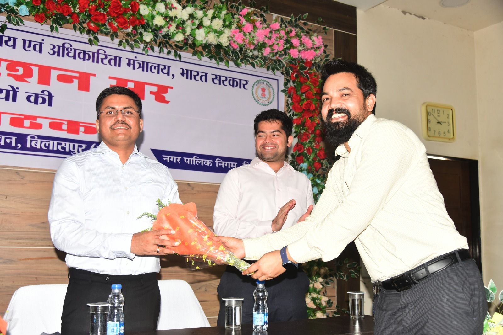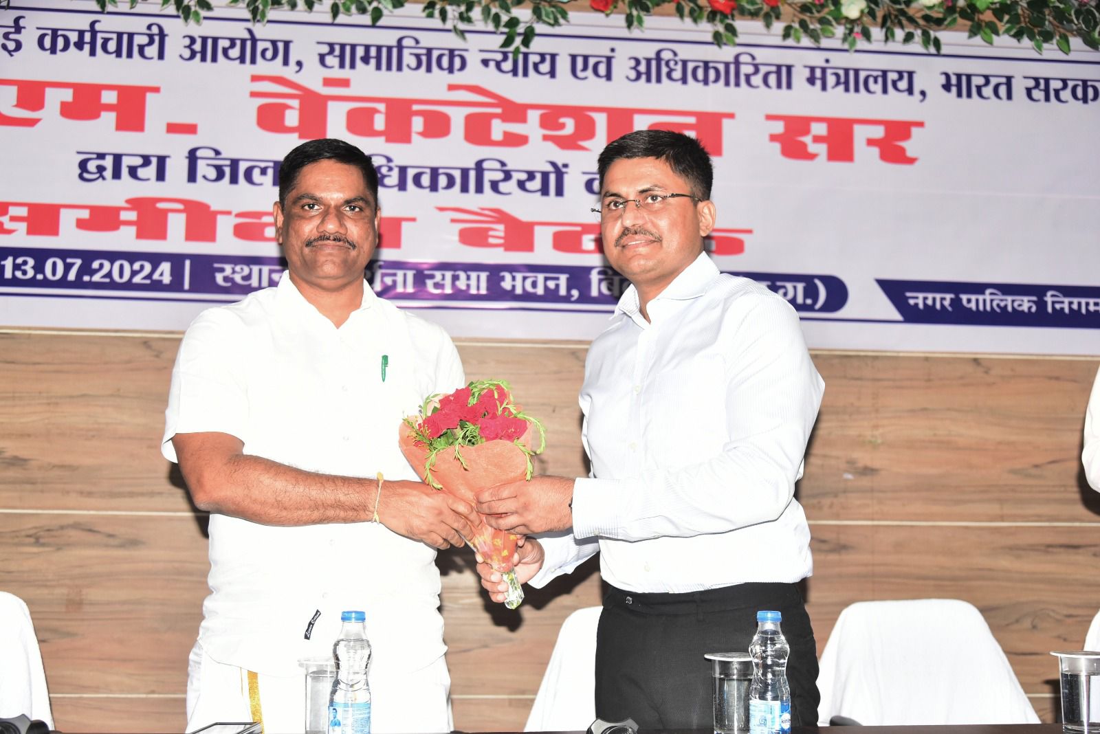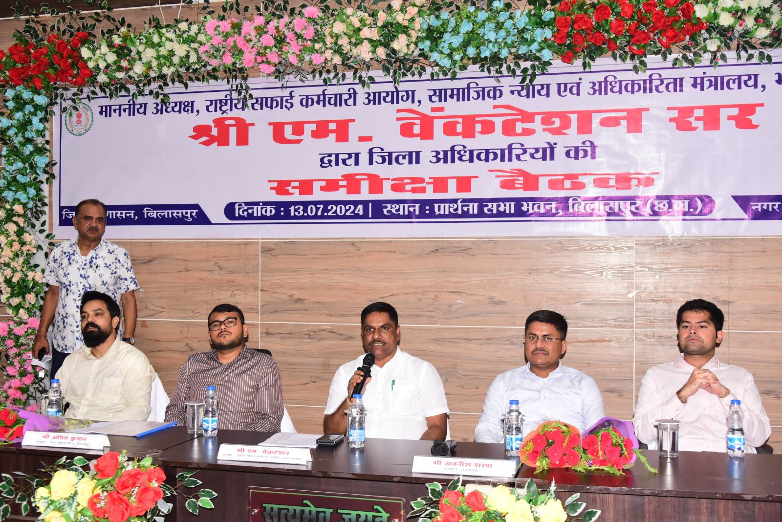 बिलासपुर, 13 जुलाई राष्ट्रीय सफाई कर्मचारी आयोग नई दिल्ली के अध्यक्ष श्री एम वेंकटेशन (केन्द्रीय राज्य मंत्री का दर्जा प्राप्त) ने आज बैठक लेकर सफाई कर्मियों की सुरक्षा और समस्याओं के संबंध में अधिकारियों को जरूरी निर्देश दिए। उन्होंने सफाई कर्मचारियों से उनकी समस्याएं विस्तार से जानी। बैठक में कलेक्टर श्री अवनीश शरण, नगर निगम कमिश्नर श्री अमित कुमार, एडीएम श्री शिव कुमार बनर्जी, सहायक कलेक्टर श्री तन्मय खन्ना सहित विभागीय अधिकारी और बड़ी संख्या में सफाई कर्मचारी मौजूद थे।