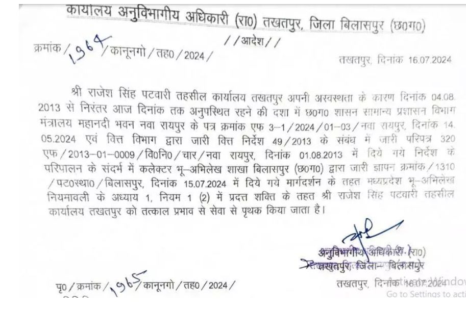 बिलासपुर,,,11 साल से अनुपस्थित पटवारी को एसडीएम ने बर्खास्त कर दिया है। पटवारी 4 अगस्त 2013 से अपनी अस्वस्थता के कारण लगातार 11 वर्षों से अनुपस्थित था। जिस पर बिलासपुर जिले के तखतपुर अनुविभाग के एसडीएम ने आदेश जारी किया हैं।