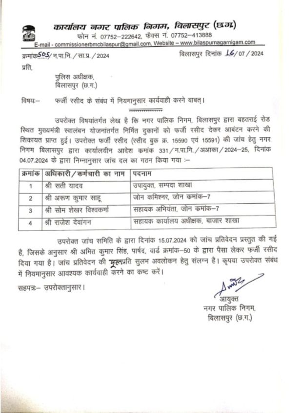 कोई निगम की रसीद काटकर किराया का पैसा ले लिया है। शिकायत सही मिलने पर दोषी को पकड़ने के लिए नगर निगम आयुक्त अमित कुमार ने निगम के संपदा शाखा के उपायुक्त सती यादव, जोन सात के कमिश्नर अरुण कुमार साहू, सहायक अभियंता सोम शेखर विश्वकर्मा और बाजार शाखा के कार्यालय अधीक्षक राजेश देवांगन को जांच करने के निर्देश दिए। फर्जी रसीद से किराया वसूलने वाले को पकड़ने की जिम्मेदारी दी। इस पर टीम ने जांच शुरु की। दुकानदारों की रसीद की जांच गई तो वह फर्जी रसीद निकला। वार्ड पार्षद अमित कुमार सिंह दुकान किराया का रसीद काटा है।