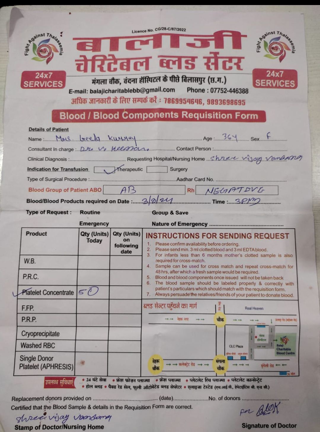 श्री विजय वंदना हॉस्पिटल बिलासपुर में भर्ती मरीज के लिए A.B निगेटिव रक्त की आवश्यकता थी! जिसकी जानकारी होने पर तारबाहर थाना प्रभारी गोपाल सतपथी ने एक कॉल में रक्तदान के लिए तैयार हुए! और राजधानी ब्लड सेंटर बिलासपुर में रक्तदान करने पहुचे।