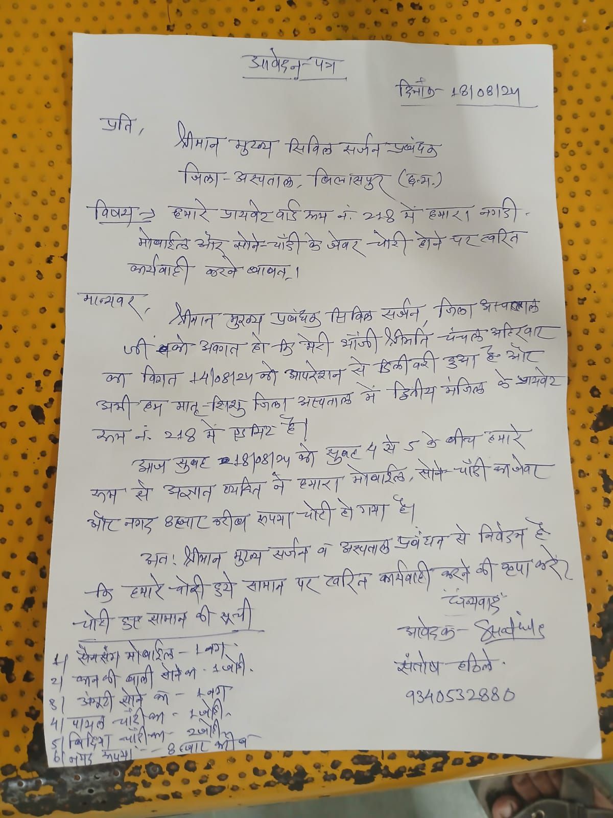 दरअसल एक 25 वर्षीय महिला चंचल अहिरवार जिनका मातृ शिशु अस्पताल (जिला अस्पताल) बिलासपुर में डिलीवरी हुई है! वह प्राइवेट वार्ड के कमरा नंबर 218 में भर्ती थी! महिला ने बताया की रात को सभी सो गए थे! उसी दौरान तड़के सुबह करीब 4 से 5 बजे के दरमियान किसी अज्ञात व्यक्ति ने हमारा सोने चांदी का जेवर मोबाइल और नगद 8 से 10 हजार रूपए के आसपास चोरी कर लें जाया गया है।