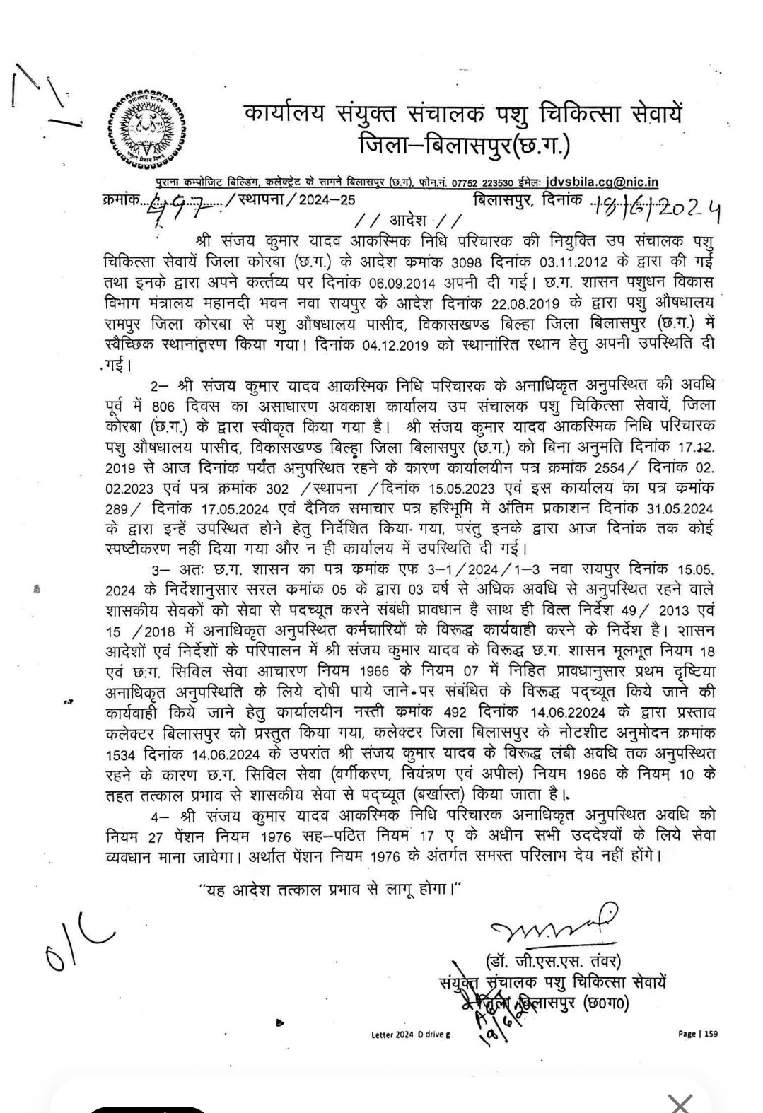 बिलासपुर,,, बिना अनुमति लंबे समय से अनुपस्थित आकस्मिक निधि परिचारक को शासकीय सेवा से बर्खास्त कर दिया गया है। कलेक्टर अवनीश शरण के निर्देश पर पशुधन विकास विभाग के संयुक्त संचालक ने परिचारक संजय कुमार यादव की बर्खास्तगी के आदेश जारी किए हैं।