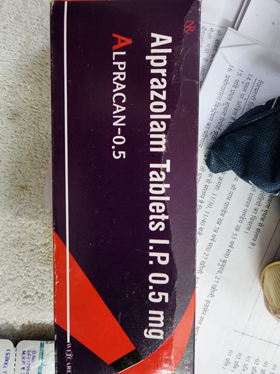 Alprazolam Tablets I.P. 0.5mg 07 पत्ता प्रत्येक में 75 गोली 75X7= 525 नग नशीली गोली तथा नगद बिक्री रकम 1250 रूपये ।