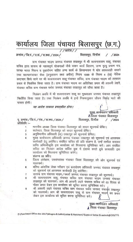 जिला पंचायत से प्राप्त जानकारी के अनुसार ग्राम पंचायत भाड़म जनपद पंचायत तखतपुर में सत्यनारायण साहू, पंचायत सचिव द्वारा शासन के महत्वपूर्ण योजनाओं जैसे राशन कार्ड वितरण, जन्म मृत्यु प्रमाण पत्र, स्वच्छ भारत मिशन व वृक्षारोपण सहित अन्य कार्य के क्रियान्वयन में घोर लापरवाही बरतने तथा छ०ग०पंचायत सेवा (अनुशासन तथा अपील) नियम 1999 के नियम 4 (ख) नैतिक कदाचार किये जाने पर श्री सत्यनारायण साहू पंचायत सचिव, ग्राम पंचायत भाड़म को तत्काल प्रभार से निलंबित किया जाता है। ग्राम पंचायत भाड़म का अतिरिक्त प्रभार अश्वनी लहरे, पंचायत सचिव ग्राम पंचायत पर्थरा जनपद पंचायत तखतपुर को सौंपा जाता है। निलंबन अवधि में सत्यनारायण साहू का मुख्यालय जनपद पंचायत तखतपुर निर्धारित किया जाता है। तथा निलंबन अवधि में इन्हें नियमानुसार जीवन निर्वाह भत्ते की पात्रता होगी।