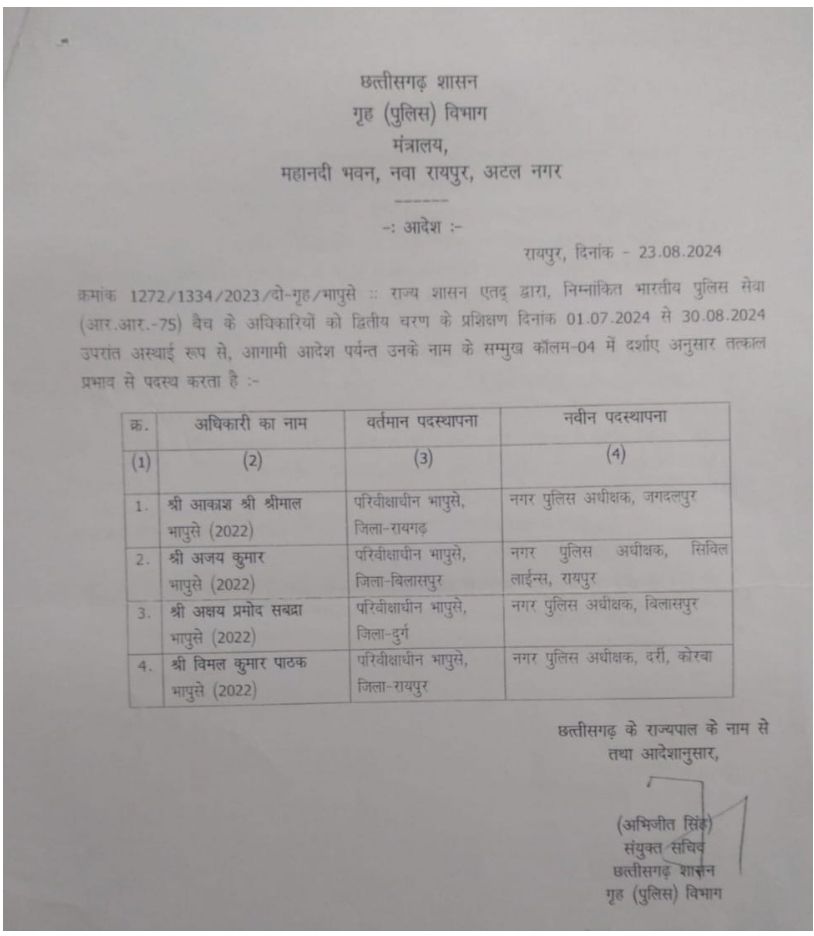 वहीं अजय कुमार रायपुर सिविल लाइंस C.S.P, अक्षय प्रमोद को बिलासपुर C.S.P और विमल कुमार पाठक को कोरबा के दर्री का C.S.P बनाया गया है।देखें आदेश
