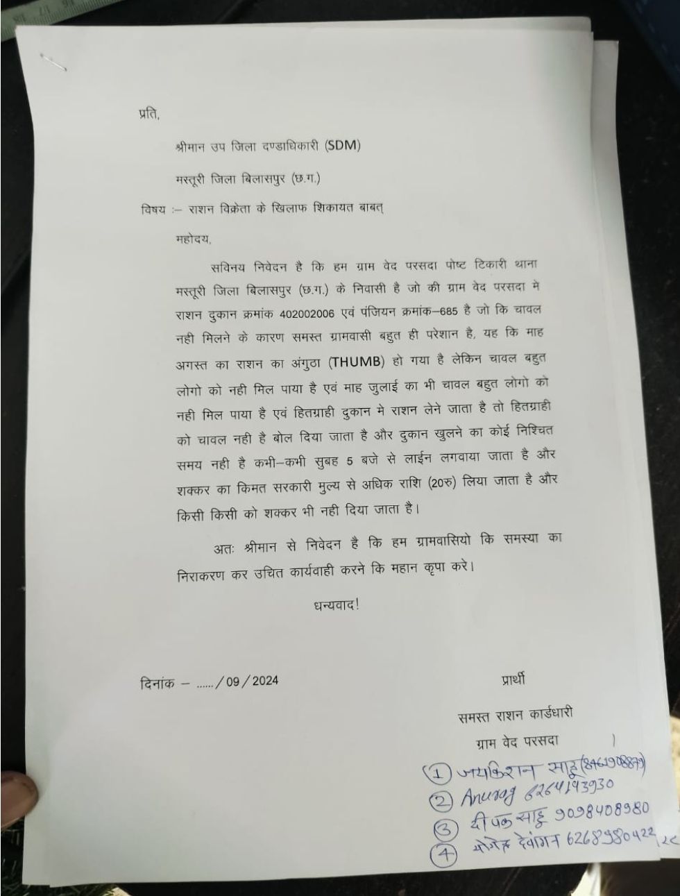 बिलासपुर,,,, मस्तूरी विकासखंड के ग्राम पंचायत वेदपरसदा में स्थित राशन दुकान क्रमांक 402002006 के संचालक के द्वारा मनमानी लगातार की जा रही थी ! जिसकी वजह से हितग्राहियों को समय पर राशन सामग्री नही मिल पा रही है। राशन दुकान संचालक की मनमानी से परेशान होकर ग्रामीणों ने इसकी शिकायत मस्तूरी SDM से की है, जिसमें उन्होंने बताया कि दुकान संचालक के द्वारा हमेशा अपनी मनमानी की जा रही है!
