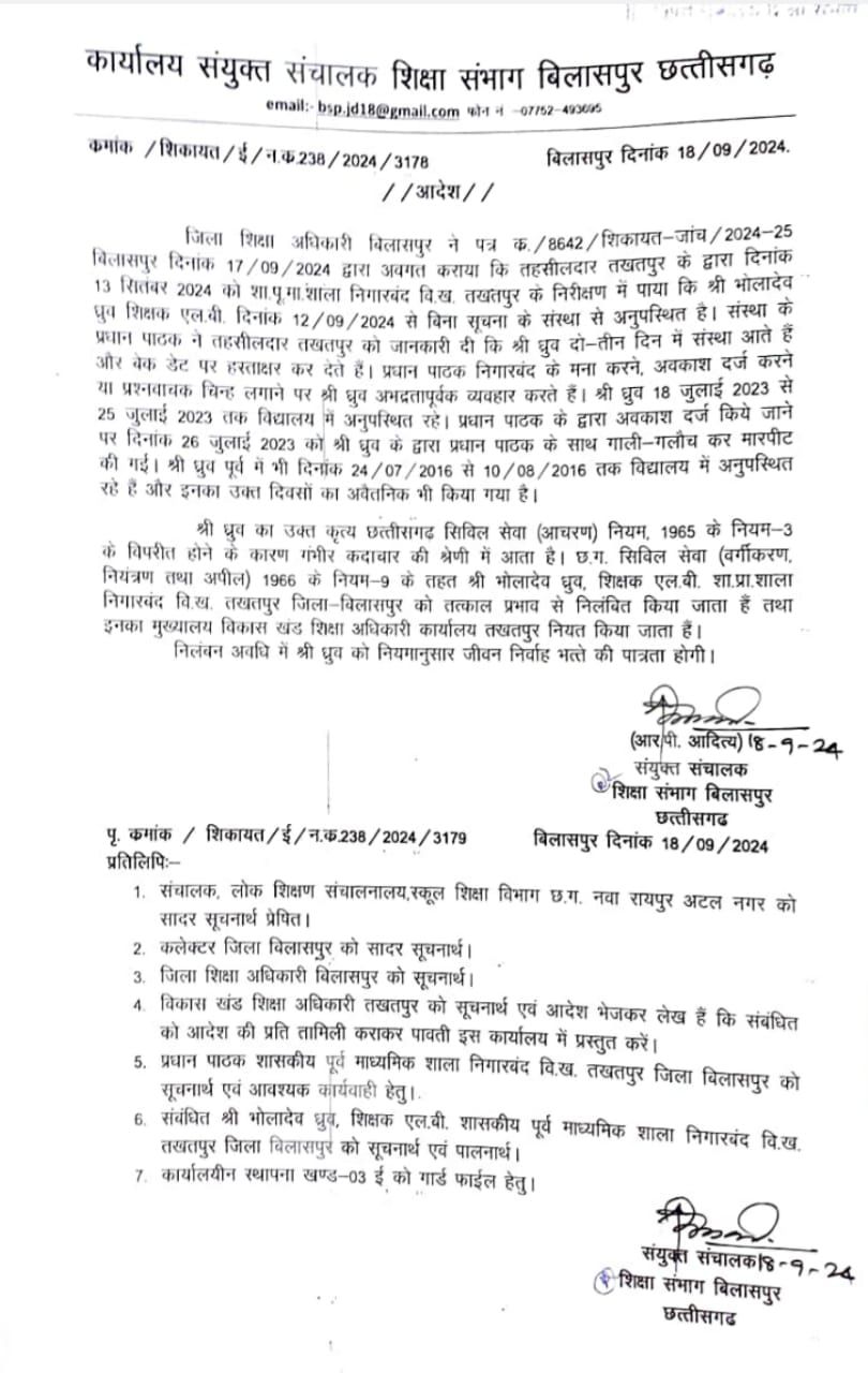 भोलादेव ध्रुव संयुक्त संचालक स्कूल शिक्षा से प्राप्त जानकारी के अनुसार जिला शिक्षा अधिकारी बिलासपुर ने 17 सितंबर को अवगत कराया कि तहसीलदार तखतपुर के द्वारा 13 सितंबर 2024 को शा.पू.मा.शाला निगारबंद वि.ख. तखतपुर का निरीक्षण किया गया। निरीक्षण में पाया कि भोलादेव ध्रुव शिक्षक एल.बी.12 सितंबर से बिना सूचना के संस्था से अनुपस्थित है। संस्था के प्रधान पाठक ने तहसीलदार तखतपुर को जानकारी दी कि श्री ध्रुव दो-तीन दिन में संस्था आते हैं और बेक डेट पर हस्ताक्षर कर देते हैं। प्रधान पाठक निगारबंद के मना करने, अवकाश दर्ज करने या प्रश्नवाचक चिन्ह लगाने पर ध्रुव अभद्रतापूर्वक व्यवहार करते हैं। श्री ध्रुव 18 जुलाई 2023 से 25 जुलाई 2023 तक विद्यालय में अनुपस्थित रहे। प्रधान पाठक के द्वारा अवकाश दर्ज किये जाने पर दिनांक 26 जुलाई 2023 को श्री ध्रुव के द्वारा प्रधान पाठक के साथ गाली-गलौच कर मारपीट की गई। श्री ध्रुव पूर्व में भी दिनांक 24 जुलाई 2016 से 10 अगस्त 2016 तक विद्यालय में अनुपस्थित रहे हैं और इनका उक्त दिवसों का अवैतनिक भी किया गया है। ध्रुव का उक्त कृत्य छत्तीसगढ़ सिविल सेवा (आचरण) नियम, 1965 के नियम-3 के विपरीत होने के कारण गंभीर कदाचार की श्रेणी में आता है। छ.ग. सिविल सेवा (वर्गीकरण, नियंत्रण तथा अपील) 1966 के नियम-9 के तहत भोलादेव ध्रुव, शिक्षक एल.बी. शा.प्रा.शाला निगास्वंद वि.ख. तखतपुर जिला-विलासपुर को तत्काल प्रभाव से निलंबित किया जाता हैं तथा इनका मुख्यालय विकास खंड शिक्षा अधिकारी कार्यालय तखतपुर नियत किया जाता है। निलंबन अवधि में ध्रुव को नियमानुसार जीवन निर्वाह भत्ते की पात्रता होगी।