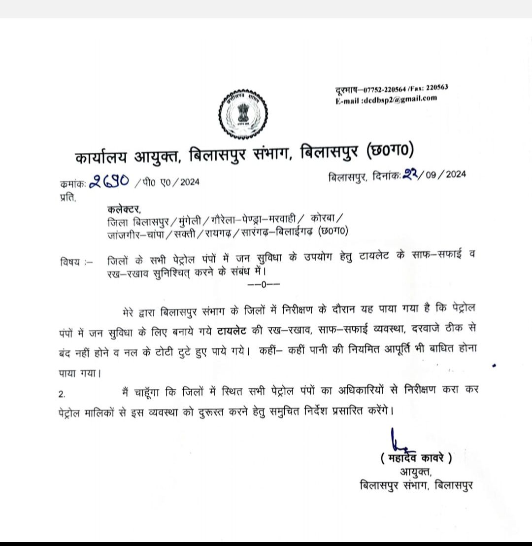 बिलासपुर,,, कमिश्नर महादेव कावरे ने पेट्रोल पंपों में आम जनता के उपयोग के लिए बने टॉयलेट की नियमित साफ सफाई और रख रखाव सुनिश्चित करने को कहा है। उन्होंने संभाग के सभी जिला कलेक्टरों को इस आशय का पत्र भी लिखा है। संभागायुक्त ने जारी पत्र में कहा है कि जिलों में भ्रमण और निरीक्षण के दौरान यह पाया गया है कि पेट्रोल पंपों में जन सुविधा के लिए बनाये गये टायलेट की रख-रखाव, साफ-सफाई व्यवस्था, दरवाजे ठीक से बंद नहीं होने व नल के टोटी टुटे हुए पाये गये हैं। कहीं कहीं पानी की नियमित आपूर्ति भी बाधित होना पाया गया। इसलिए जिलों में स्थित सभी पेट्रोल पंपों का अधिकारियों से निरीक्षण करा कर पंप मालिकों से इस व्यवस्था को दुरूस्त करने हेतु समुचित निर्देश प्रसारित करेंगे।