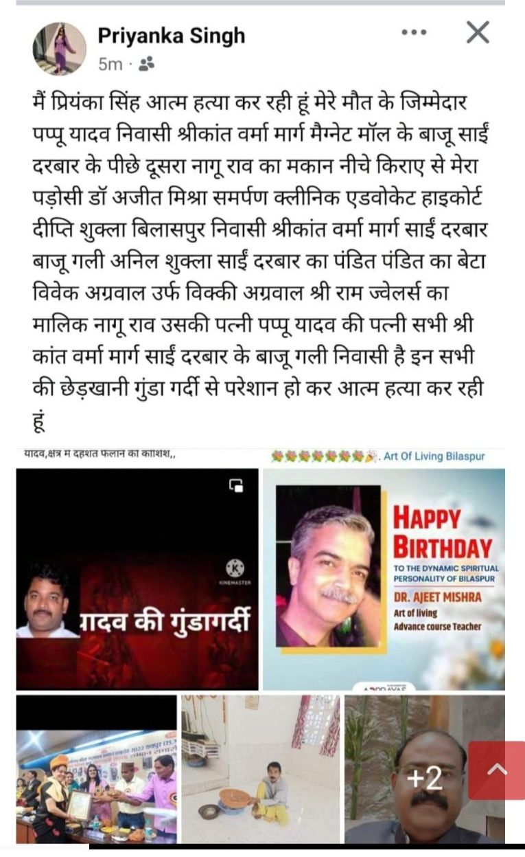 पुलिस के मुताबिक श्रीकांत वर्मा मार्ग पर साईं मंदिर के पीछे गली में रहने वाले रेलवे के टीटीई अजय सिंह की पत्नी प्रियंका सिंह ने रविवार को सुबह फेसबुक पर लाइव आकर पड़ोसियो पर छेड़खानी और रसूखदारों द्वारा लागातार परेशान करने का आरोप लगा कर फाँसी लगाने पोस्ट डाला। इस आशय की जानकारी मिलने पर तारबाहर टीआई जयप्रकाश गुप्ता मौके पर पहुँचे और उन्होंने सिविल लाइन टीआई प्रदीप आर्य को कॉल कर तलब किया।