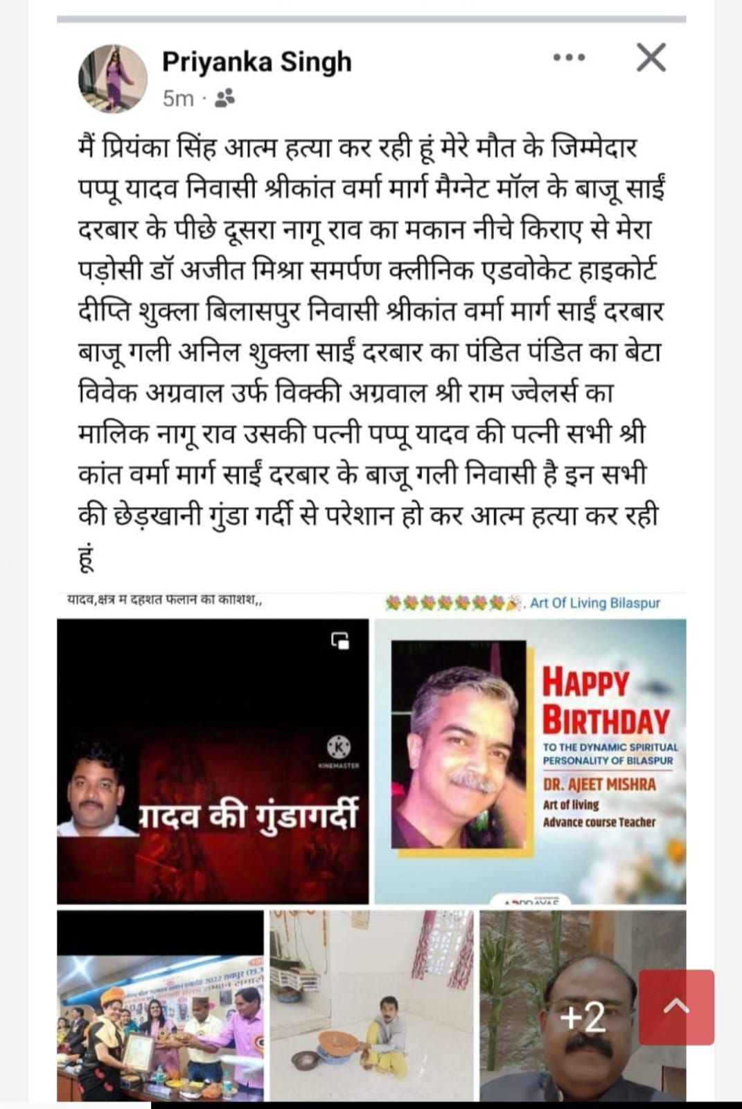सोशल मीडिया प्लेटफार्म में रेलवे कर्मचारी की पत्नी प्रियंका सिंह ने रविवार को आत्महत्या करने से पूर्व शहर के नामचीन और रसूखदारों के नाम से वीडियो वायरल की।जिसके बाद आनन फानन में पुलिस हरकत में आई।लेकिन जब तक पुलिस पहुंची तब तक गृहणी ने अपने घर में फांसी लगाकर आत्महत्या कर ली।जिसके बाद पुलिस मार्ग कायम कर आगे जांच में जुट गई थी।वही सोमवार को सिविल लाइन पुलिस ने इस मामले अपराध पंजीबद्ध कर लिया है।जिसमे आत्महत्या के लिए उकसाने और प्रताड़ना का मामला कायम कर लिया गया।वही इस मामले में सिविल लाइन सीएसपी निमितेश सिंह ने बताया की मृतिका के द्वारा जारी वायरल वीडियो और पोस्ट में जिनका नाम लिया गया उनके खिलाफ अपराध दर्ज किया गया। पप्पू यादव निवासी, नागू राव, डॉ अजीत मिश्रा, दीप्ति शुक्ला,अनिल शुक्ला साईं दरबार का पंडित,पंडित का बेटा,विवेक अग्रवाल उर्फ विक्की अग्रवाल इन सभी के नाम पर अपराध दर्ज किया गया है।पुलिस आगे की जांच में जुट गई।