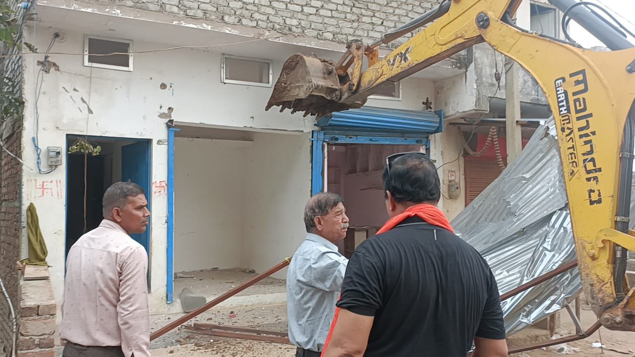 निगम प्रशासन ने खमतराई के वार्ड क्रमांक 58 काली मंदिर के पास बिना अनुमति के वाणिज्यिक और आवासीय निर्माण कराने वाले मणिशंकर त्यागी के अवैध निर्माण को जमींदोज कर दिया जिसमें चार दुकाने और मकान बनाया गया था।
