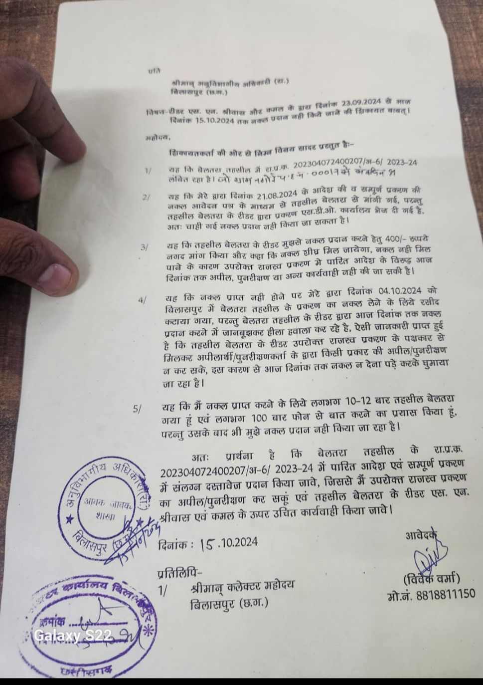 कलेक्टर से की गई लिखित शिकायत में नगोई निवासी विवेक वर्मा ने बताया कि उसने बेलतरा तहसील में लंबित राजस्व प्रकरण क्रमांक 202304072400207/-6/ के प.ह. नम्बर 00017 के नकल के लिए गत 21 अगस्त को आबेदिन किया। लेकिन रीडर ने पूरी नस्ती एसडीएम कार्यालय भेजने का हवाला देकर नकल देने से इनकार कर दिया। जबकि रीडर ने जल्द नकल देने के एवज में 400 रुपये भी लिया था। नकल न मिल पाने के कारण वह