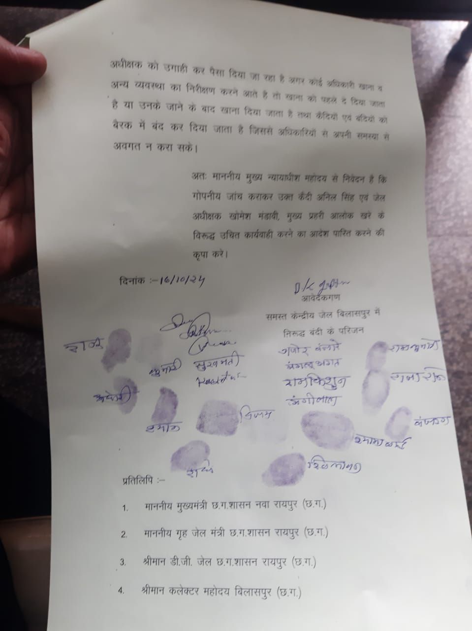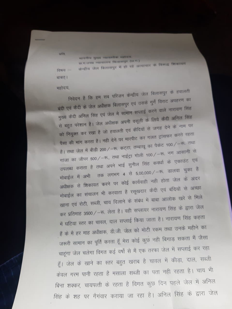 पत्र में लिखा गया है कि निवेदन है कि हम सब परिजन केन्द्रीय जेल बिलासपुर के हवालती। बंदी एवं कैदी के जेल अधीक्षक बिलासपुर एवं उसके गुर्गे विराट अपहरण का मुख्य कैदी अनिल सिंह एवं जेल में सामान सप्लाई करने वाले नारायण सिंह से बहुत परेशान है। जेल अधीक्षक अपनी वसूली के लिये कैदी अनिल सिंह को नियुक्त कर रखा है जो हवालती एवं कैदियों से जगह देने के नाम पर पैसा की मांग करता है। नही देने पर मारपीट कर गलत ट्रांसफर करते रहता है। तथा जेल में बीड़ी 200/-रू. कट्टा, तम्बाखू का पैकेट 100/-रू. तथा गांजा का जीपर 500/-रु. तथा नाईट्रा गोली 100/-रू नग आसानी से उपलब्ध कराता है तथा अपने भाई सुनील सिंह कवर्धा के एकाउंट एवं मोबाईल में अभी तक लगभग 4 से 5,00,000/-रू. डालवा चुका है अधीक्षक से शिकायत करने पर कोई कार्यवाही नहीं होता जेल के अंदर मोबाईल का संचालन भी करवाता है रसूखदार कैदी एवं बंदियों से अच्छा खाना एवं रोटी, सब्जी, चाय दिलाने के संबंध में बाबा आलोक खरे से मिले कर प्रतिमाह 3500/-रू. लेता है।