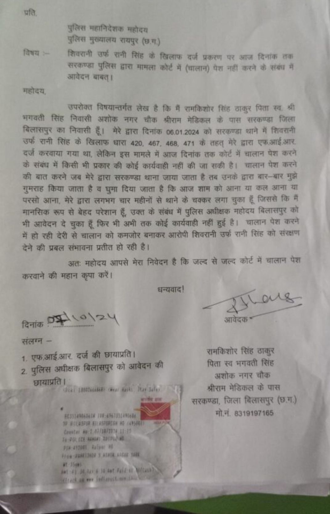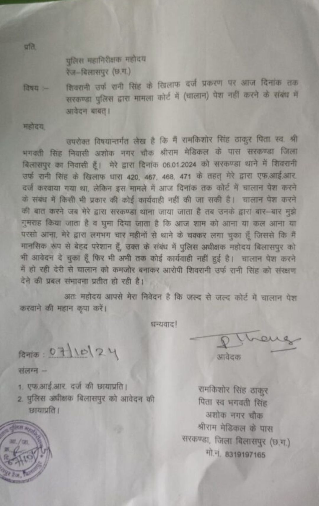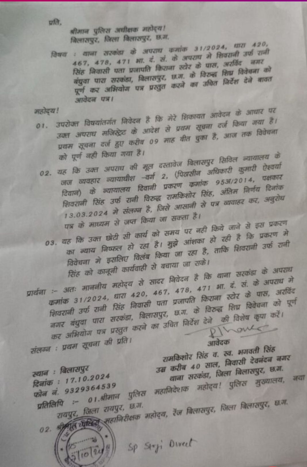 इस प्रकार का आरोप लगाते हुए रामकिशोर सिंह ने मामले की बिलासपुर S P एवं पुलिस महानिदेशक I G को इस विषय में अवगत कराया है! परिवाद दायर करने के बाद हुआ था मामला दर्ज पूर्व में भी की जा चुकी थी शिकायत एक बड़ी हैरानी कर देने वाली बात सामने आई है!